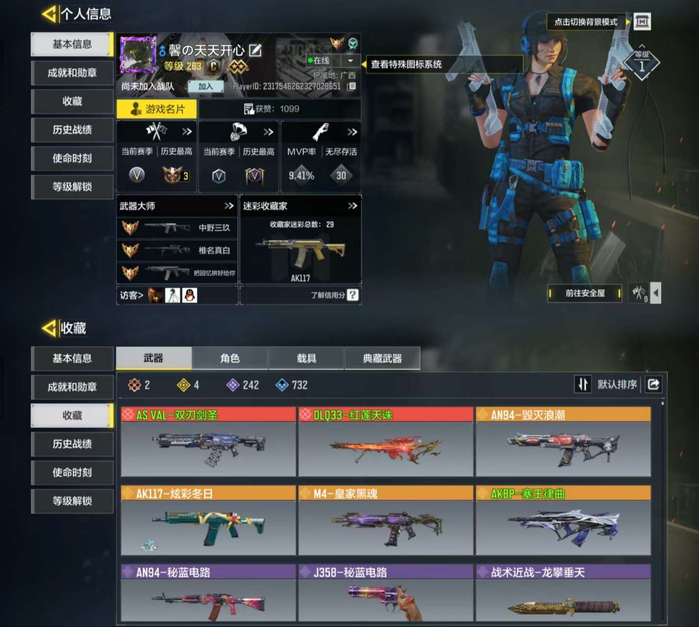 HXS229【2神话4传说】有二次 安q使命 2神话 4传说 角色等级263 段位白银V【2神话 4传说 242史诗枪皮 67史诗角色 26史诗载具】AS VAL-双刃剑圣 DLQ33-红莲天诛 AN94-毁灭浪潮 AK117-炫彩冬日 M4-皇家黑魂 AKBP-塞壬律曲