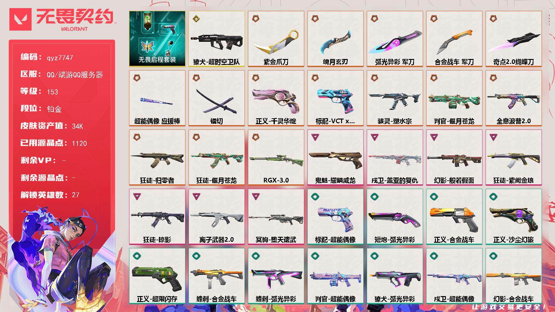 DDD 2025冠军小号,具体看图 便宜出!!![101703762] [13899824]31橙皮 6金皮 9紫皮 110皮肤 27英雄 111卡面 1250已用源晶 白银段位 【亮点皮肤】:幻影-2024全球冠军赛,战刀-2024全球冠军赛【套装】:上古龙炎套装,2024全球冠军赛套装,RGX 11z Pro//3.0套装,全息波普//2.0套装【近战武器皮肤】:神圣领域 战刀,龙爪,诡秘蛇影,荒土机兵热能刀,堕天遗武 仪式匕首,蝴蝶刀-侦察力量,爪刀-RGX 11z Pro 3.0,再见安打,超能偶像 应援棒,全息战斧,落英飞旋,金角扇【佩枪皮肤】:狂怒-上古龙炎,正义-塑水宗,正义-RGX 11z Pro 3.0,鬼魅-盖世英雄,鬼魅-侦察力量,鬼魅-盖亚的复仇,标配-全息波普//2.0,标配-VCTxT1,短炮-海洋之星【冲锋枪皮肤】:蜂刺-混沌序曲,骇灵-艾沃莉的梦之翼【霰弹枪皮肤】:判官-上古龙炎,雄鹿-源能者危机001,判官-全息波普【步枪皮肤】:狂徒-上古龙炎,狂徒-混沌序曲,狂徒-盖亚的复仇,狂徒-塑水宗,狂徒-无人之境,狂徒-全息波普//2.0,幻影-侦察力量,幻影-破败军械,幻影-全息波普//2.0,戍卫-天界神兵【狙击枪皮肤】:冥驹-上古龙炎,冥驹-偃月苍龙,莽侠-RGX 11z Pro 3.0,冥驹-千灵华绽,冥驹-全息波普//2.0【机枪皮肤】:战神-奇点,奥丁-艾沃莉的梦之翼,奥丁-西部未来【挂饰】:超能偶像挂饰,薰衣草之心挂饰,袖珍捷风挂饰,双城之战小蛋糕挂饰,双城之战魄罗挂饰,神中神挂饰,RGX11zPro3.0挂饰,2024全球冠军赛挂饰,VCTxT1挂饰,糖葫芦挂饰,迷你机甲挂饰