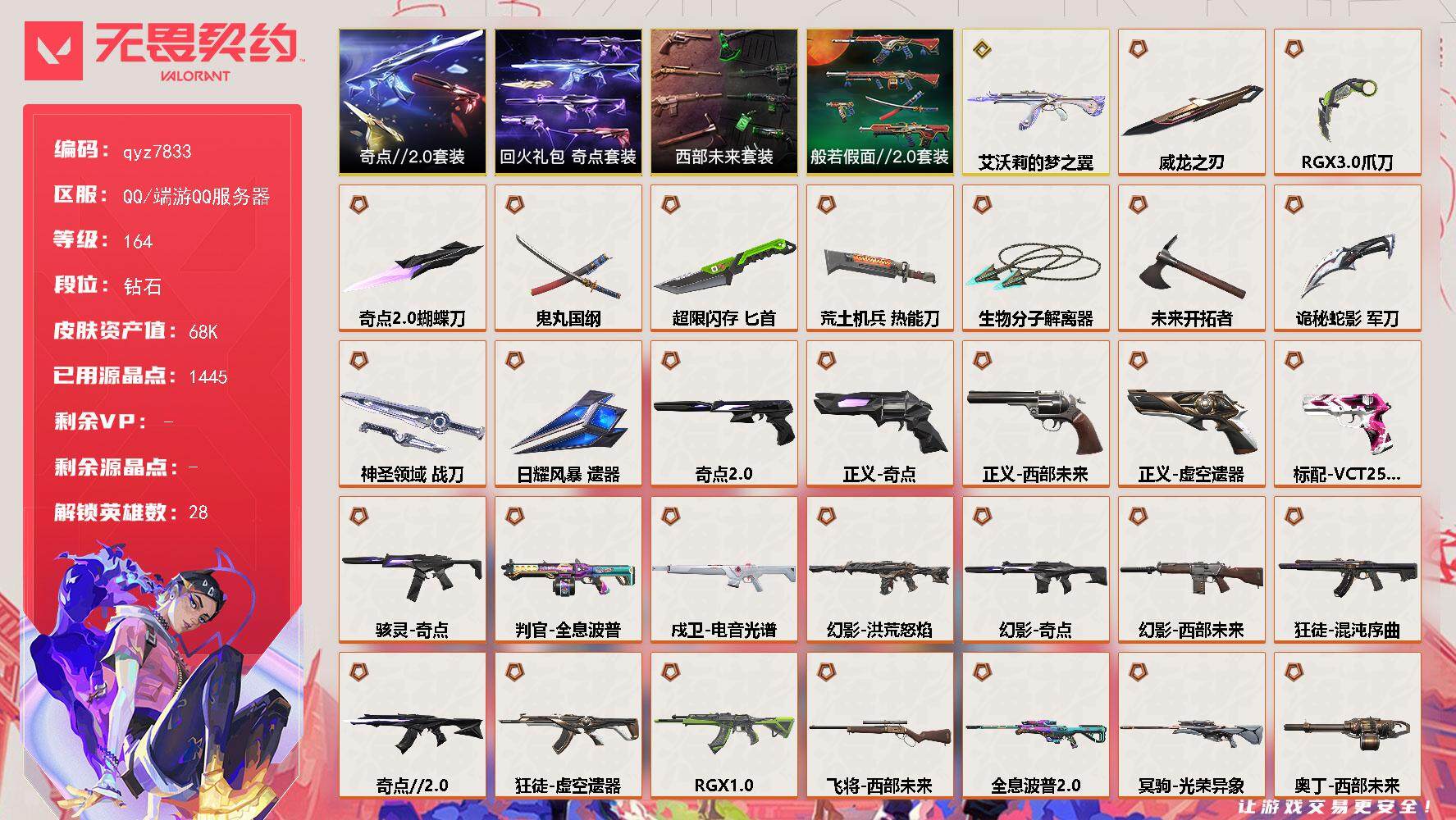 DDD 2025冠军小号,具体看图 便宜出!!![101703762] [13899824]31橙皮 6金皮 9紫皮 110皮肤 27英雄 111卡面 1250已用源晶 白银段位 【亮点皮肤】:幻影-2024全球冠军赛,战刀-2024全球冠军赛【套装】:上古龙炎套装,2024全球冠军赛套装,RGX 11z Pro//3.0套装,全息波普//2.0套装【近战武器皮肤】:神圣领域 战刀,龙爪,诡秘蛇影,荒土机兵热能刀,堕天遗武 仪式匕首,蝴蝶刀-侦察力量,爪刀-RGX 11z Pro 3.0,再见安打,超能偶像 应援棒,全息战斧,落英飞旋,金角扇【佩枪皮肤】:狂怒-上古龙炎,正义-塑水宗,正义-RGX 11z Pro 3.0,鬼魅-盖世英雄,鬼魅-侦察力量,鬼魅-盖亚的复仇,标配-全息波普//2.0,标配-VCTxT1,短炮-海洋之星【冲锋枪皮肤】:蜂刺-混沌序曲,骇灵-艾沃莉的梦之翼【霰弹枪皮肤】:判官-上古龙炎,雄鹿-源能者危机001,判官-全息波普【步枪皮肤】:狂徒-上古龙炎,狂徒-混沌序曲,狂徒-盖亚的复仇,狂徒-塑水宗,狂徒-无人之境,狂徒-全息波普//2.0,幻影-侦察力量,幻影-破败军械,幻影-全息波普//2.0,戍卫-天界神兵【狙击枪皮肤】:冥驹-上古龙炎,冥驹-偃月苍龙,莽侠-RGX 11z Pro 3.0,冥驹-千灵华绽,冥驹-全息波普//2.0【机枪皮肤】:战神-奇点,奥丁-艾沃莉的梦之翼,奥丁-西部未来【挂饰】:超能偶像挂饰,薰衣草之心挂饰,袖珍捷风挂饰,双城之战小蛋糕挂饰,双城之战魄罗挂饰,神中神挂饰,RGX11zPro3.0挂饰,2024全球冠军赛挂饰,VCTxT1挂饰,糖葫芦挂饰,迷你机甲挂饰