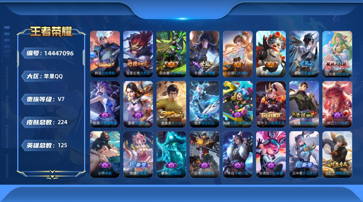 商品描述:[14447096]Xr44256-苹果Q-V7-永恒钻石IV段位-125英雄-224皮肤-1典藏皮肤-6传说-51史诗【英雄全皮】:影全皮【荣耀典藏】:韩信弑枪猎影【传说皮肤】:云缨幻光神枪,李信一念神魔,虞姬云霓雀翎,百里玄策白虎志,梦奇胖达荣荣,孙尚香末日机甲【限定皮肤】:白起狰,姜子牙天穹之誓,狄仁杰阴阳师,虞姬凯尔特女王,赵云皇家上将,孙尚香蔷薇恋人,庄周蜃楼王,孙膑妖精王,扁鹊炼金王,芈月重明,夏侯惇朔风刀,甄姬游园惊梦,曹操烛龙,典韦穷奇,狄仁杰魔术师,狄仁杰万华元夜,项羽海滩派对,老夫子醍醐杖,老夫子航海奇遇记,程咬金演武夺筹,牛魔御旌,钟馗驱傩正仪,杨玉环遇见飞天,太乙真人饕餮,鬼谷子原初探秘者,百里玄策白虎志,弈星混沌棋,明世隐疑决卦,裴擒虎李小龙,裴擒虎擒涛扼浪,狂铁御狮,米莱狄御霄,云中君纤云弄巧,盾山御銮,上官婉儿梁祝,嫦娥拒霜思,鲁班大师探海日志,桑启海盐诗旅,艾琳女武神,阿古朵江河有灵,张良古海寻踪,高渐离燃音魔法,妲己灵卜魔法,鬼谷子天穹祈灯,伽罗琥珀纪元,沈梦溪龙舞盛年,鲁班七号蔬乡物语,李元芳蔬乡物语,刘邦剑破天穹,周瑜熔金海岸【年限皮肤】:百里玄策白虎志【赛季限定】:庄周蜃楼王,孙膑妖精王,扁鹊炼金王,白起狰,芈月重明,夏侯惇朔风刀,曹操烛龙,典韦穷奇,狄仁杰万华元夜,老夫子醍醐杖,程咬金演武夺筹,张良古海寻踪,牛魔御旌,虞姬凯尔特女王,钟馗驱傩正仪,太乙真人饕餮,鬼谷子原初探秘者,弈星混沌棋,明世隐疑决卦,裴擒虎擒涛扼浪,狂铁御狮,米莱狄御霄,盾山御銮,鲁班大师探海日志,桑启海盐诗旅,鬼谷子天穹祈灯,刘邦剑破天穹,姜子牙天穹之誓【战令限定】:老夫子航海奇遇记,高渐离燃音魔法,妲己灵卜魔法,鲁班七号蔬乡物语,李元芳蔬乡物语【史诗皮肤】:露娜紫霞仙子,赵云皇家上将,赵云未来纪元,貂蝉圣诞恋歌,甄姬冰雪圆舞曲,王昭君偶像歌手,狄仁杰魔术师,宫本武藏鬼剑武藏,孙尚香蔷薇恋人,孙尚香水果甜心,嬴政摇滚巨星,妲己魅力维加斯,妲己女仆咖啡,墨子金属风暴,吕布圣诞狂欢,刘禅绅士熊喵,曹操幽灵船长,李白千年之狐,吕布末日机甲,张飞乱世虎臣,花木兰水晶猎龙者,刘邦德古拉伯爵,夏侯惇乘风破浪,小乔缤纷独角兽,兰陵王暗隐猎兽者,甄姬游园惊梦,亚瑟心灵战警,雅典娜冰冠公主,安琪拉心灵骇客,百里守约特工魅影,蔡文姬舞动绿茵,李元芳逐浪之夏,阿轲节奏热浪,杨
