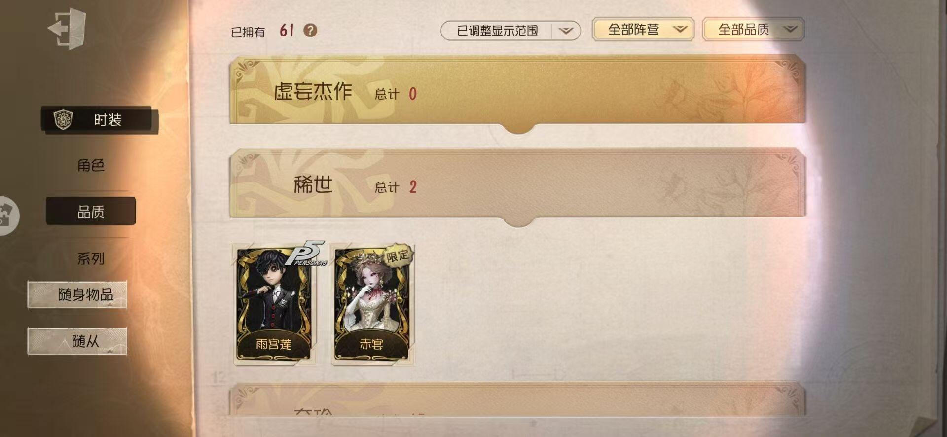 [14349997]苹果官服 邮箱账号 1虚妄杰作 243时装 13金皮 70紫皮 18随从 101随身物品 【时装】:古董商-招风旗,渔女-垂泪的神女,使徒-多加雷萨,小说家-最原终一,画家-温暖的平安夜,古董商-木兰,园丁-异想Hello Kitty,爱哭鬼-摩诺,渔女-百万人鱼,律师-亚伯拉罕·葛雷,祭司-“绯”,渔女-Chef K,古董商-填海平,邮差-秋日随想,“囚徒”-天海兰太郎,调香师-提炼师,古董商-黑鸦,咒术师-椰香假日,杂技演员-雨宫莲,杂技演员-JOKER,空军-爱神之吻,记者-伊布,红蝶-融化的泪琥珀,大副-雷斯垂德探长,雕刻家-善忘的海马体,骑士-艺术品商人,爱哭鬼-善恶的本性,教授-吟游诗人,画家-掌中篆记,26号守卫-秘密大厨,小说家-无归的昨日,冒险家-赞因,“法罗女士”-向深处求告,魔术师-动力芯,幸运儿-蛋小黄的好朋友,古董商-墨韵,宿伞之魂-桃面书生,摄影师-“琥珀”,勘探员-盛夏飞盘,“法罗女士”-VIOLET,古董商-菌丝研究,先知-纯白之盐,调酒师-逐浪的玫瑰,“法罗女士”-芳泽霞,“小女孩”-异动指针,小说家-“伊始新篇”,园丁-郁金香之梦,破轮-沙滩漂移,蜡像师-收藏品,空军-新岛真,空军-QUEEN,祭司-“朝圣者”,机械师-佐仓双叶,空军-“苏珊娜”,蜡像师-淋浴,魔术师-梅林,昆虫学者-可妮兔,“杰克”-夜来香,大副-明智吾郎,“噩梦”-随机数,红蝶-仙鹤,红蝶-彼岸,红蝶-更纱,红夫人-贝拉夫人,红蝶-竹华,舞女-高卷杏,舞女-女武神,舞女-PANTHER,调香师-致命温柔,调香师-Lady K,调香师-红菱艳,调香师-摩涅莫绪涅之梦,调香师-花序,园丁-奥村春,先知-月相,“小女孩”-年岁,前锋-坂本龙司,盲女-海西遗风,梦之女巫-川上富江,摄影师-月下绅士,入殓师-喜多川祐介【随身物品】:荣光的残像(稀世),茅龙书(稀世),夏(稀世),遗忘之花(稀世),火火火(奇珍),指挥(奇珍),海岸花环(奇珍),海之低语(奇珍),集邮册(奇珍),回旋镖(奇珍),炸药桶(奇珍),“全熟”(奇珍),凝固的声音(奇珍),漂浮(奇珍),充气海豚(奇珍),沙漠精灵(奇珍),咖啡壶(稀世),德米特里1号(奇珍),聚集哨笛(奇珍),手摇铃(奇珍),酩酊(奇珍),心海之梦(奇珍),欢呼(奇珍),糖果鬼(奇珍),秘密(奇珍),折柳(稀世),海底遗物(奇[13739442]苹果官服 邮箱账号 208时装 15金皮 63紫皮 8随从 78随身物品 【时装】:守夜人-KNIGHT-c3,破轮-胡桃夹子,勘探员-盖提亚之遗,飞行家-异相睡眠,小丑-捣蛋裘克,爱哭鬼-摩诺,作曲家-幽灵帆,舞女-西尔菲德,佣兵-中岛敦,园丁-宇宙女巫,杂技演员-茶话会,记者-华生小姐,“囚徒”-OPH.LUCA,骑士-Mentor K,教授-吟游诗人,病患-溯光,“杰克”-加里,雕刻家-善忘的海马体,邮差-华生医生,小丑-OPH.JOKER,邮差-潘塔龙,小说家-“伊始新篇”,哭泣小丑-熄灭的太阳,“法罗女士”-芳泽霞,时空之影-“有机磷”,入殓师-“温室”,“记录员”-删除符,击球手-迫降专家,哭泣小丑-炮弹飞船,勘探员-中原中也,爱哭鬼-雪上小王子,红夫人-女大公,画家-江户川乱步,红蝶-更纱,舞女-高卷杏,调酒师-海盐特调,幸运儿-双一,小丑-变脸王,魔术师-广津柳浪,梦之女巫-信使,前锋-SKULL,梦之女巫-川上富江,前锋-坂本龙司,摄影师-宿醉,“囚徒”-太宰治