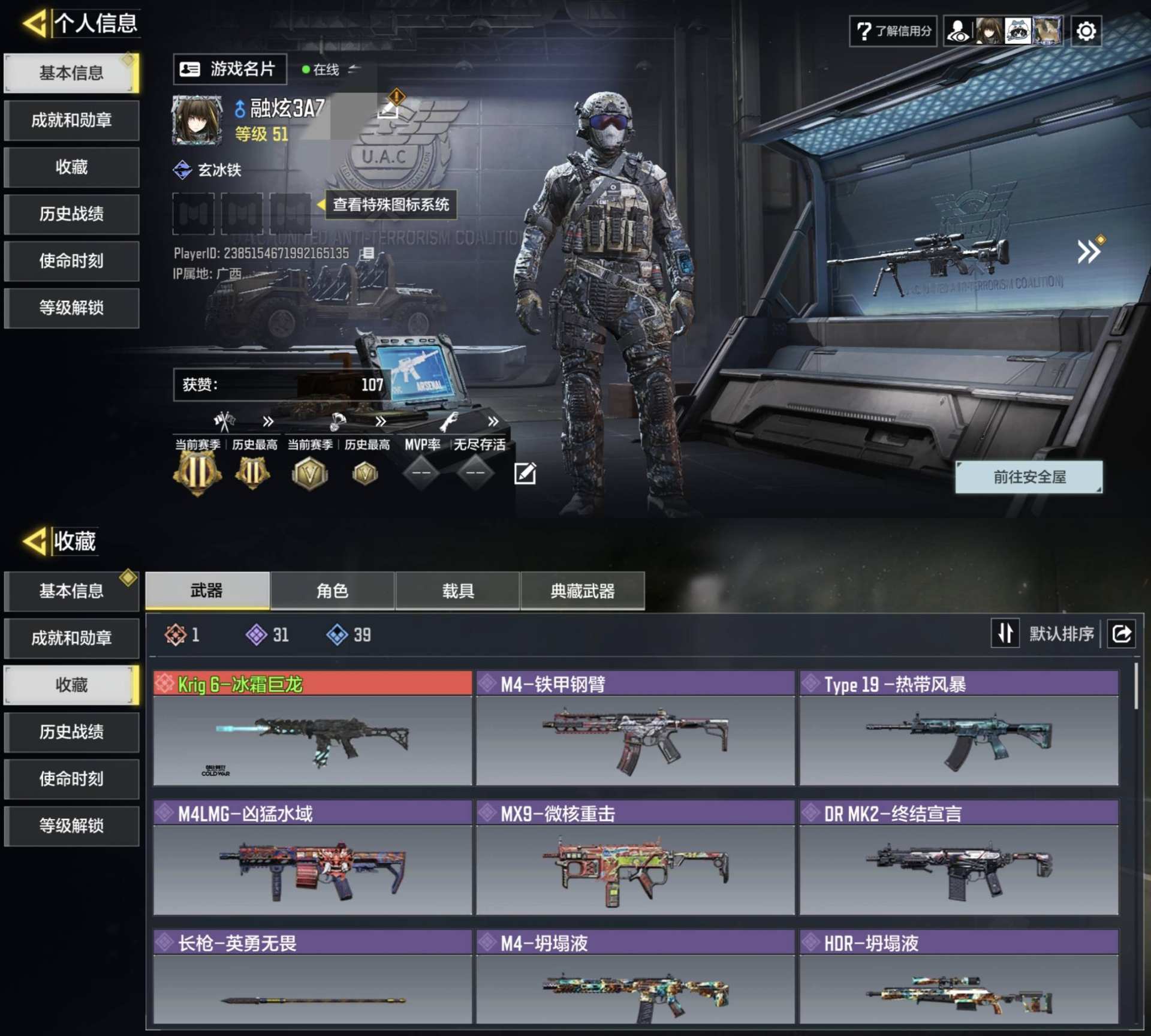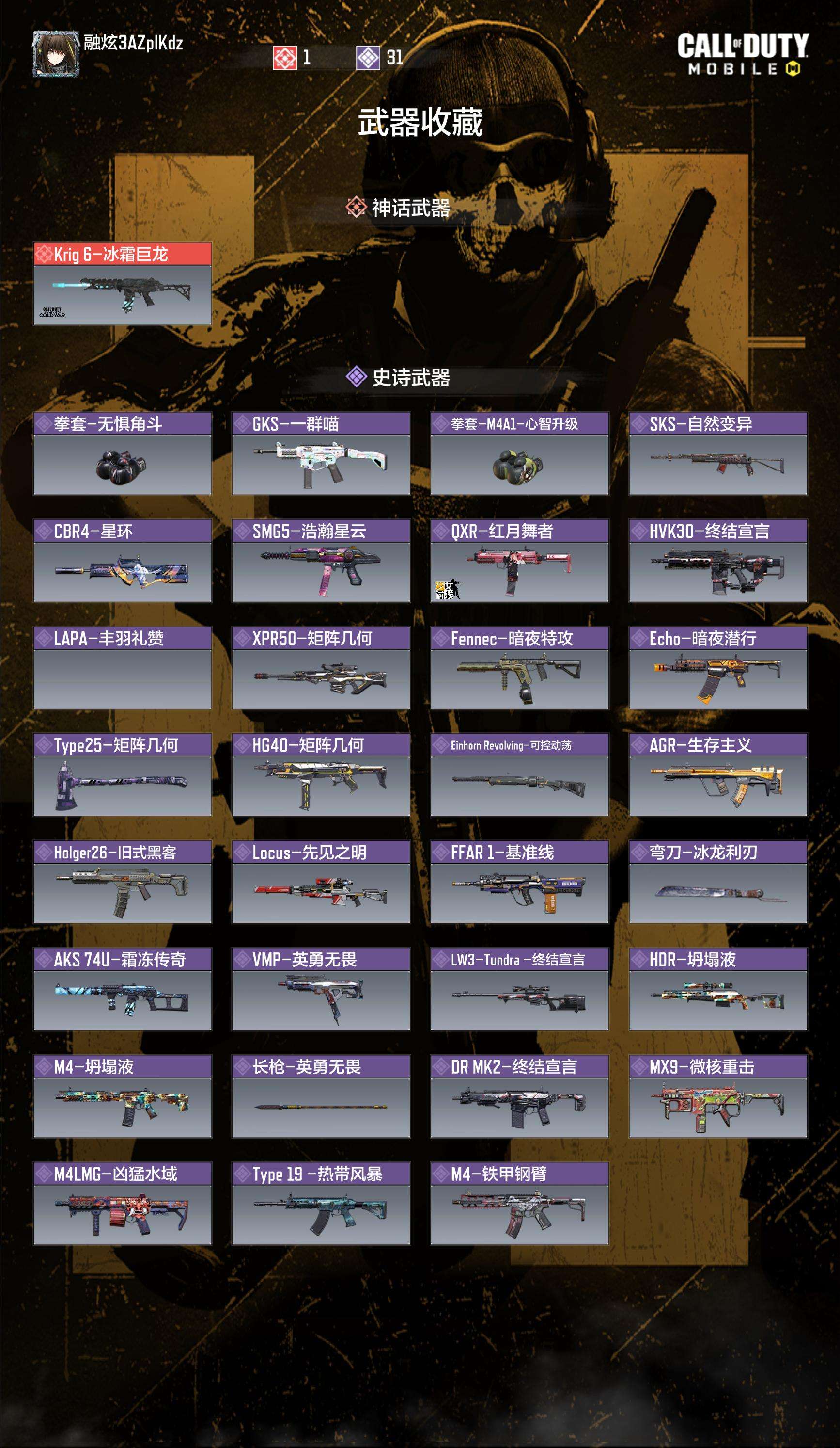 [14554554]363级 3神话 5传说 290史诗 段位黄金 可二次 可修改实名 【神话枪械】:Krig 6-冰霜巨龙,DLQ33-红莲天诛,AK47-三重幻境【传说枪械】:M4-皇家黑魂,Type25-赤焰复仇,SA80-狂暴冲锋,DLQ33-先进火力,DRH-蝮蛇潜渊