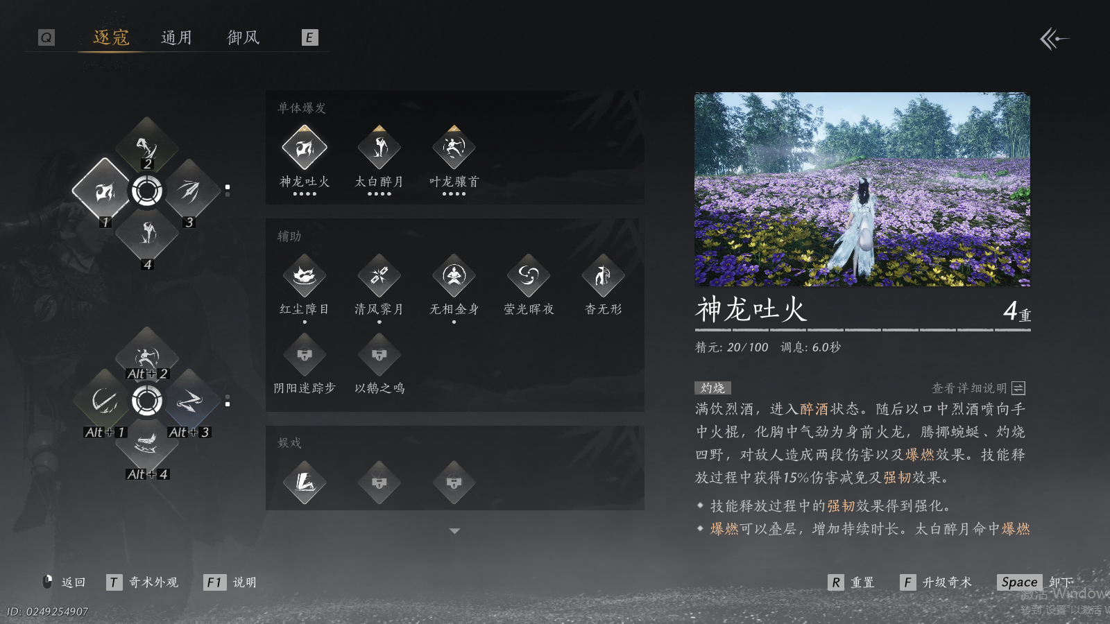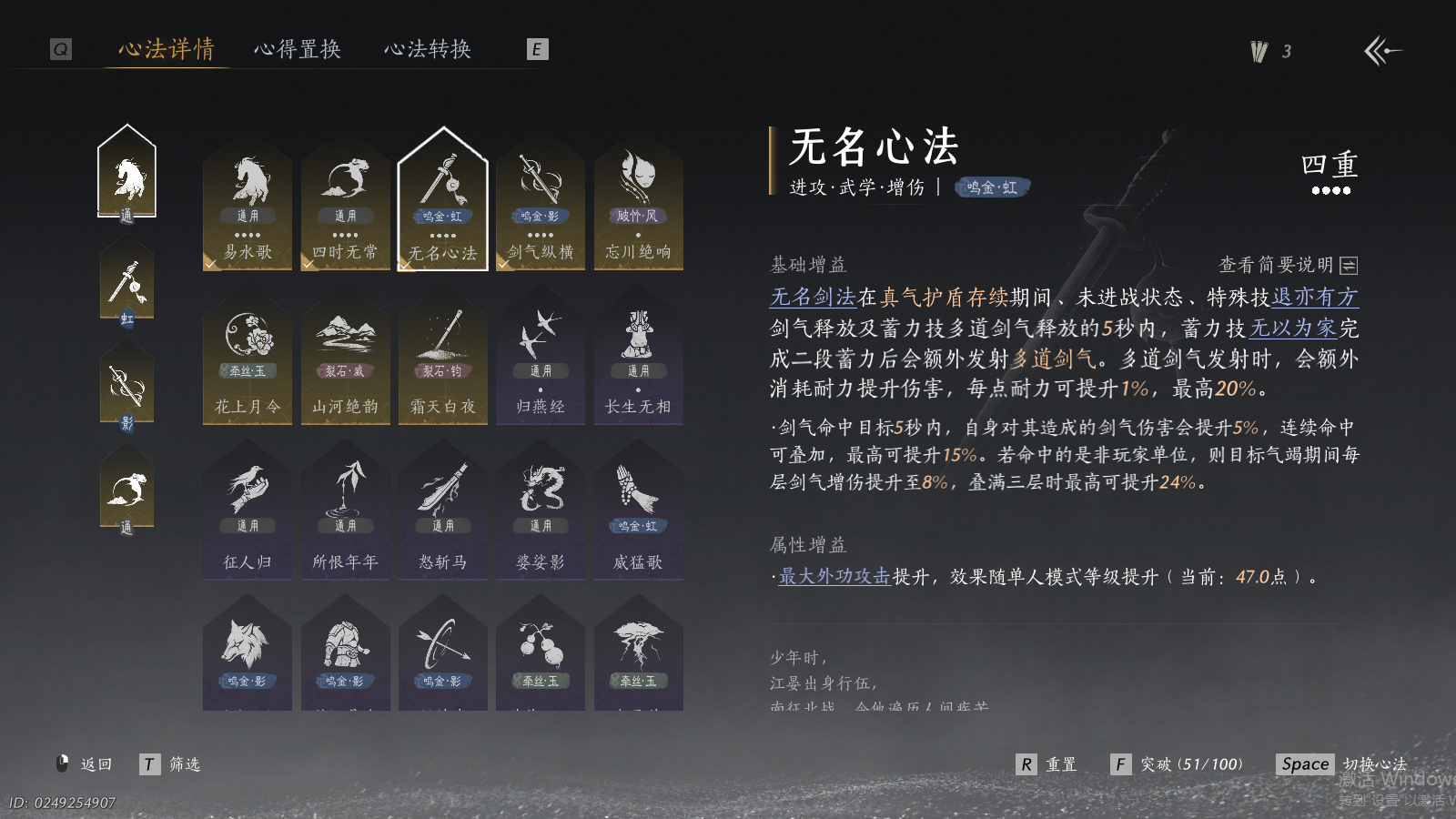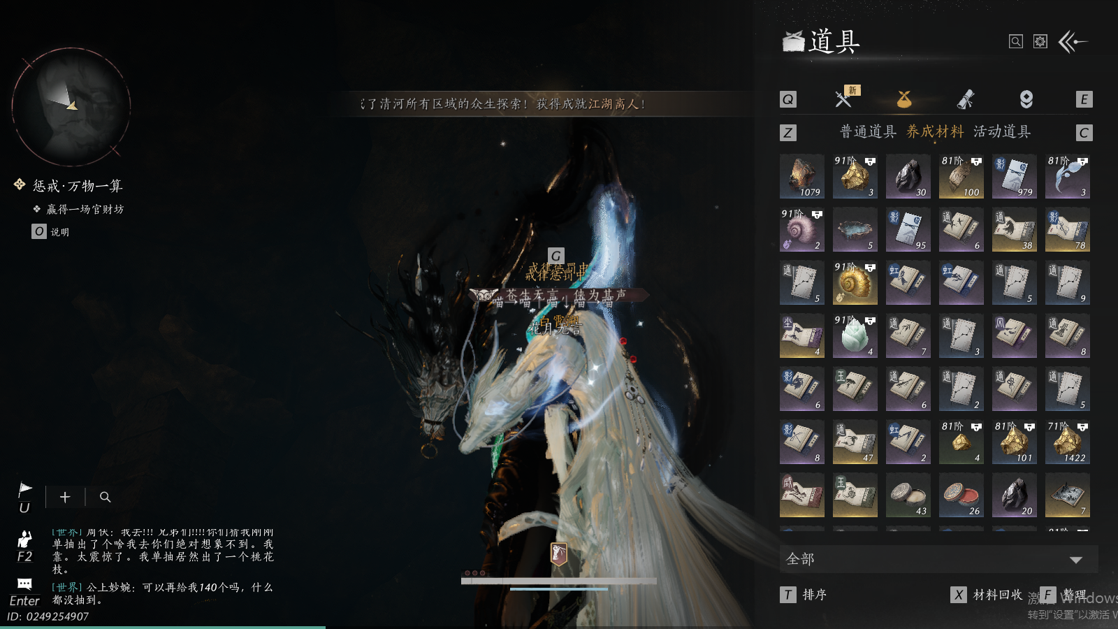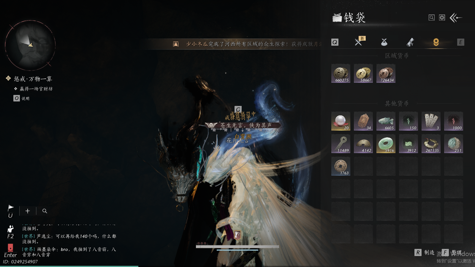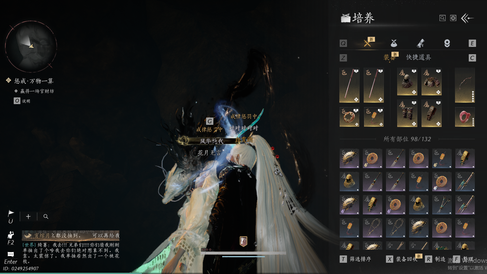 风华值36963 武林造诣(鹅)34980 已用八音窍数量3 未用八音窍数量0 等级100 角色性别【文本】女 【绝境】 【无换绑CD】 【未绑定或可换绑】 【未注册】 【不支持人脸包赔】 【女】 【无】 【是】 【是】 稀有套装4 稀有发型1 套装40 武器外观8 坐骑3 其他武器外观4 稀有套装:问春何苦,晏平生,青丘千岁,瑞鹤仙; 稀有发型:鹊桥仙; 套装:云中锦书,青玉案,山水一砚,剑影藏心,鹊踏枝,清音晓,贺新词,雁还乡,红尘书,花问春言,芳时歇,午风清,南风熏,一心三藏,逐红花,遥夜行,江湖客,上青云,花月天真,舞花间,松花玉兰,墨沉丹朱,白龙,青阳,赤沙,丹雀,射虎南山,金池鲤,瑞鹤仙,翠羽顾,雪狸儿,梨花泪,清河强者,西凉鬼啸,鹊衔夜,蜀戏春,龙凤缠,九间当铺,驰走西风,百花应诏; 武器外观:霜枫愁,木棍,葱葱那年,月中诗,霜枫诀,霜枫眠,霜枫尽,霜枫横; 坐骑:飞毛腿,白义,飒露子; 其他武器外观:霜枫愁,木棍,葱葱那年,月中诗;