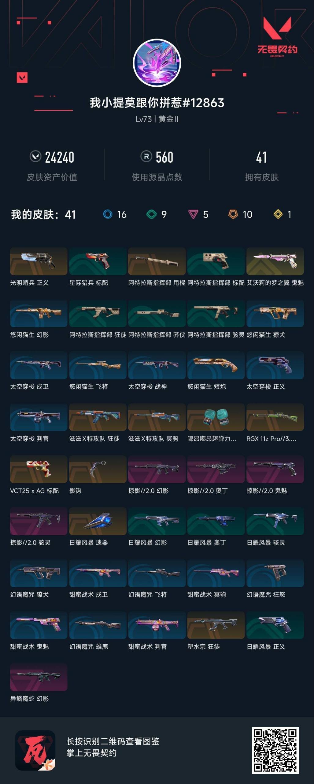 商品描述:[13695384]10橙皮 1金皮 5紫皮 41皮肤 21英雄 56卡面 560已用源晶 黄金段位 【套装】:滋滋X特工队,掠影2.0套装【近战武器皮肤】:影钩,阿特拉斯指挥部【佩枪皮肤】:标配-VCT25xAG,正义-光明哨兵,鬼魅-掠影2.0,鬼魅-艾沃莉的梦之翼【冲锋枪皮肤】:骇灵-掠影2.0【步枪皮肤】:幻影-异鳞魔蛇,狂徒-滋滋X特攻队,幻影-掠影2.0,狂徒-塑水宗【狙击枪皮肤】:冥驹-滋滋X特攻队,莽侠-RGX 11z Pro 3.0【机枪皮肤】:奥丁-掠影2.0【挂饰】:神中神挂饰,V25第三幕:黑铁 挂饰,VCTxAG挂饰,飞刀挂饰