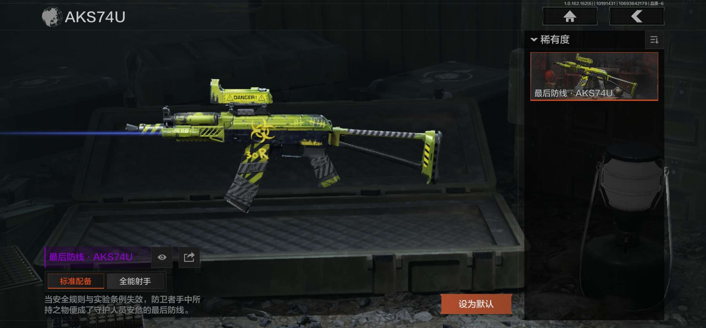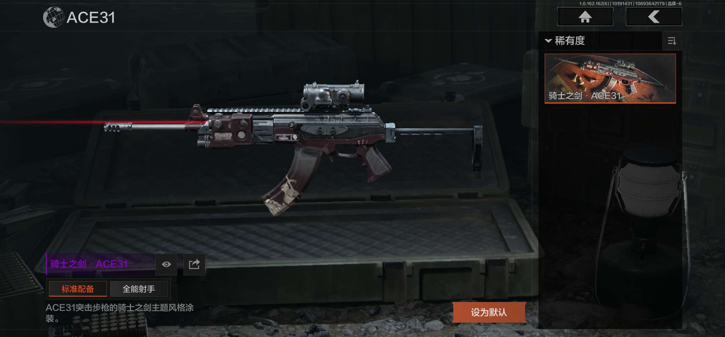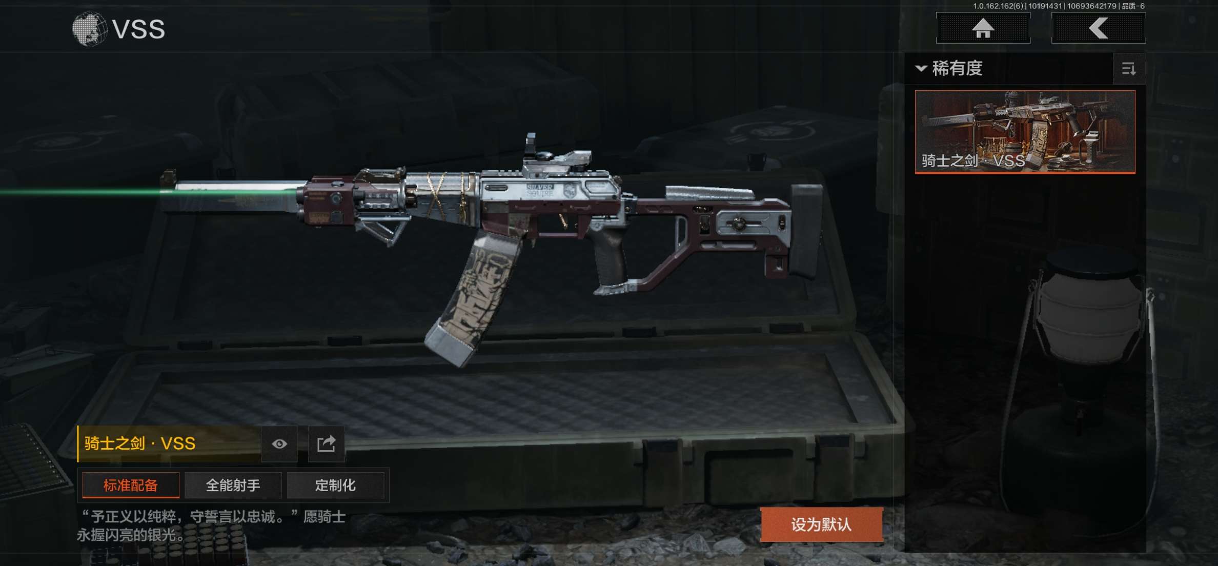 商品描述:AQ367安卓Q-仓库价值28.7M-等级30-科恩币18000--1金枪-社交违规-可二刀皮 工兵铲【金皮】骑士之剑·VSS 【枪皮】最后防线·AKS74U 竞技·AUG 骑士之剑·ACE31 黑金国际·M110