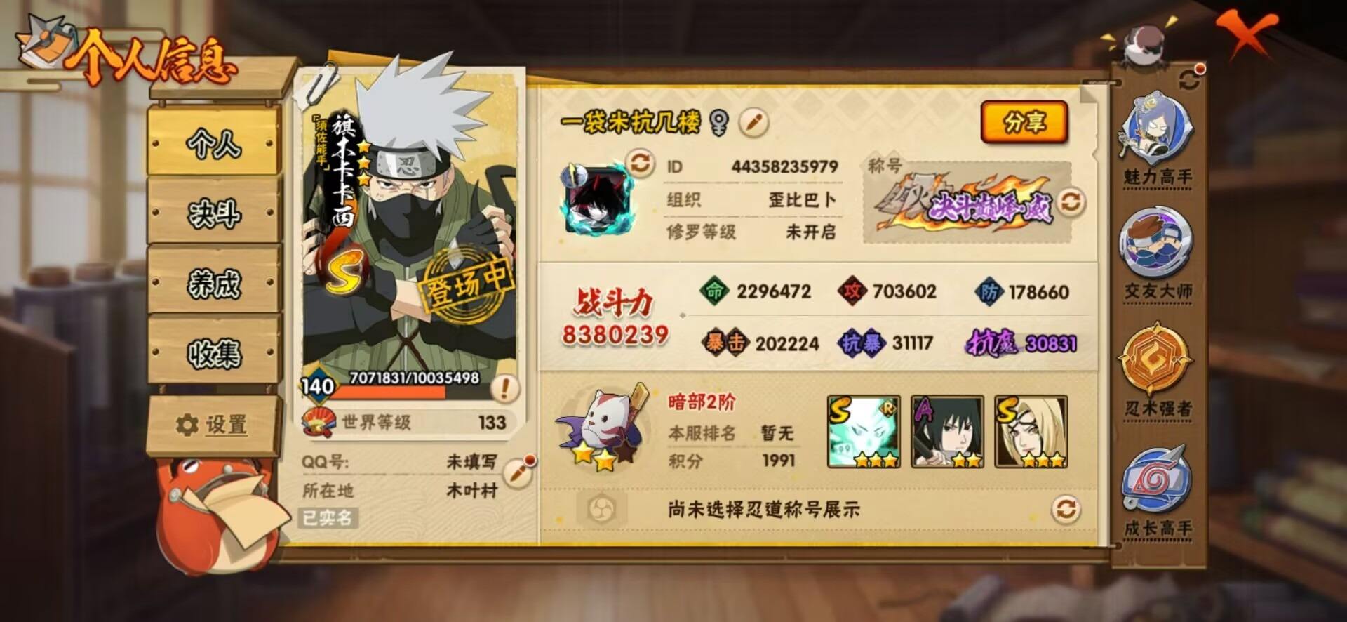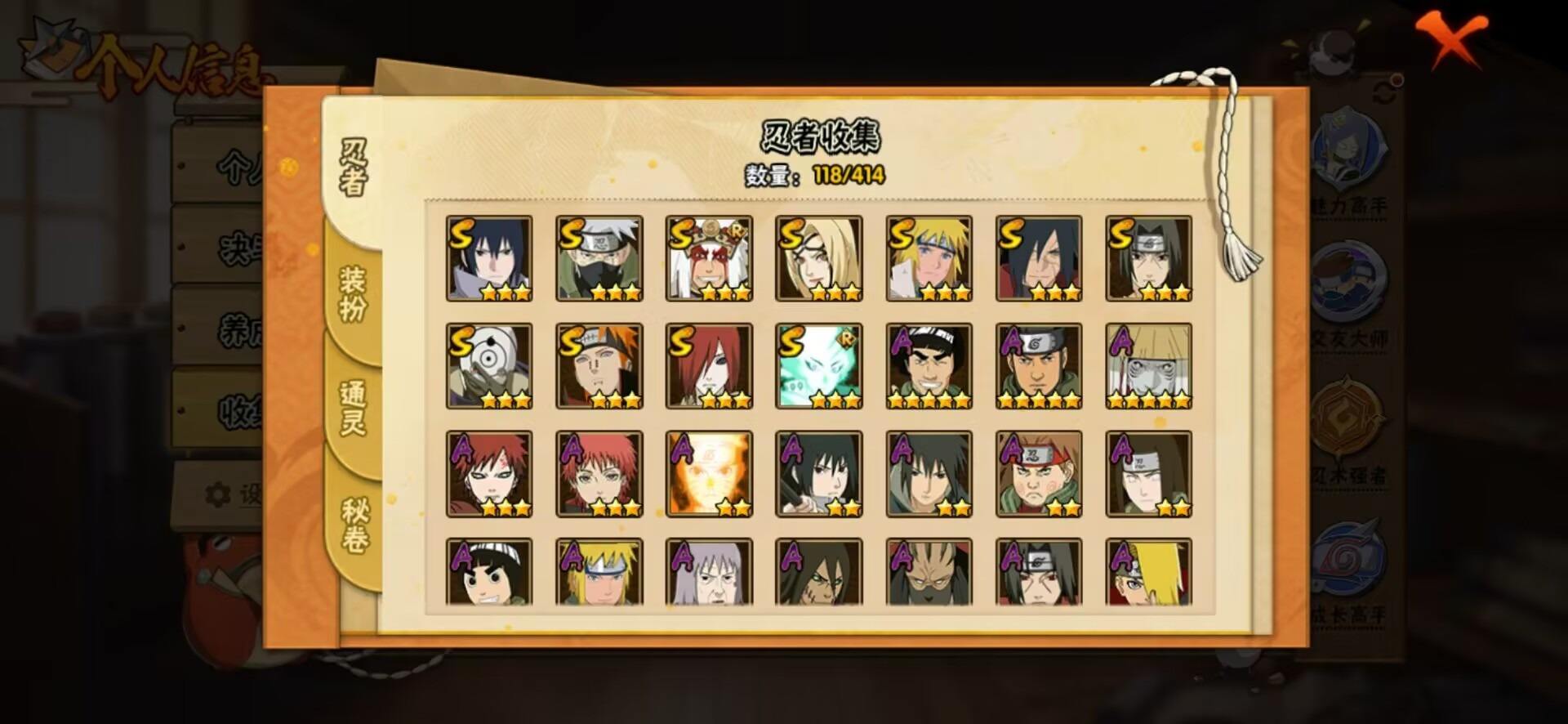 商品描述:[14494702]V6 11S忍 20A忍 15通灵 838W战力 可二次 可修改实名 【S级忍者】:宇智波斑「秽土转生·解」,宇智波佐助「永恒万花筒」,自来也 「舞之豪杰」,旗木卡卡西「须佐能乎」,大筒木舍人 「最终章」,宇智波斑「白面具」,纲手「百豪」,长门「秽土转生」,宇智波鼬 「须佐能乎」,佩恩「天道」,波风水门
