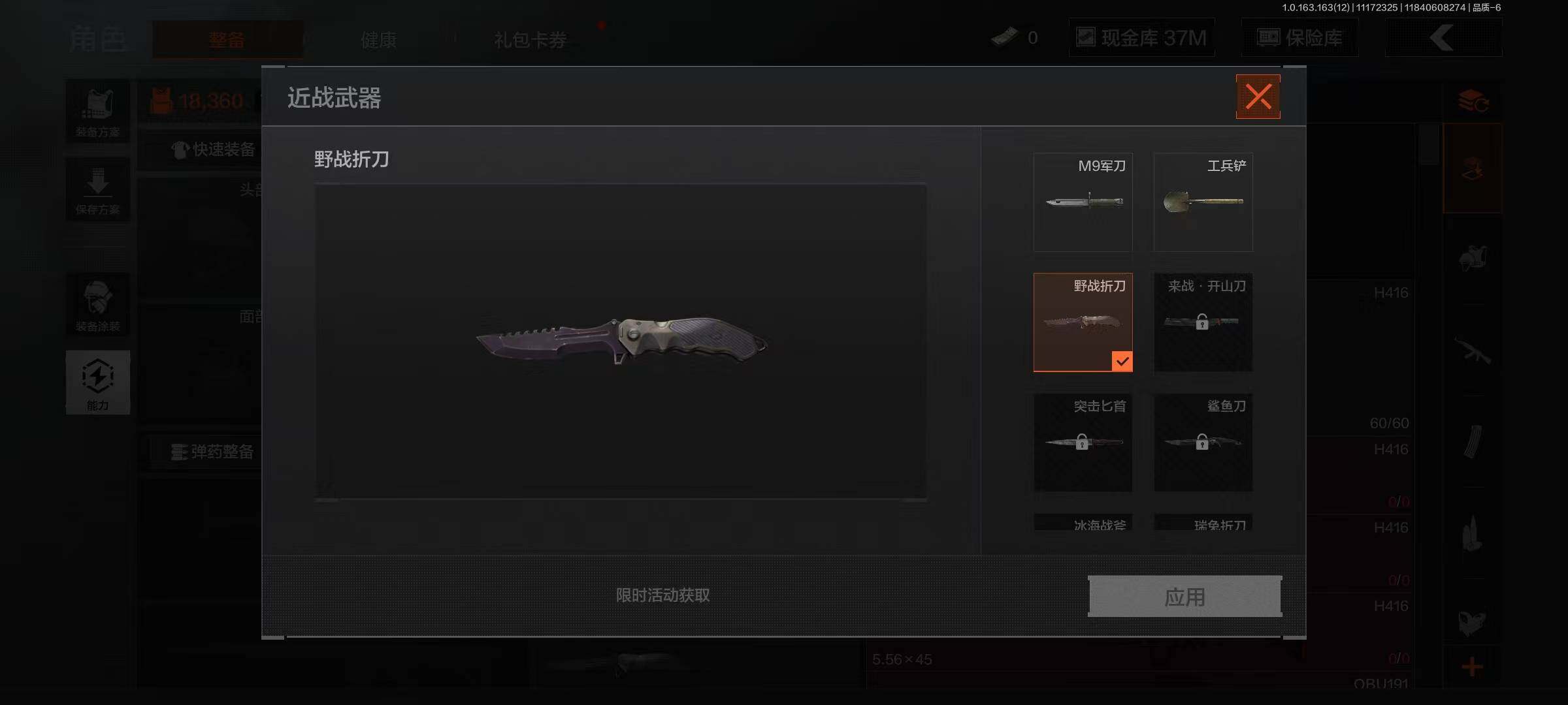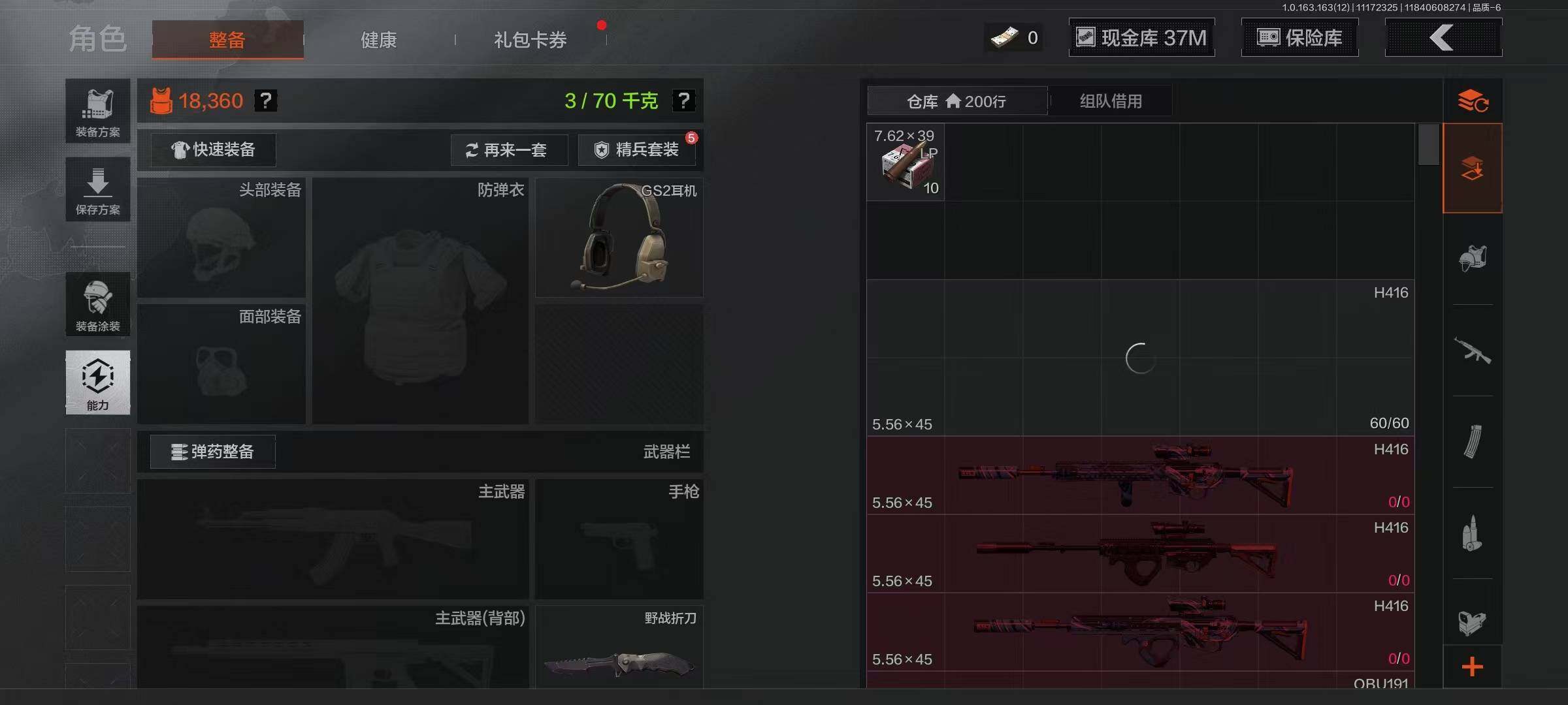 库存价值9.9 5近战武器 1金套装 1金枪皮 可修改实名 【柯恩币数量】:57345【角色装扮(金)】:火绒·塔莉娅【近战武器】:来战·开山刀,瀚星斩铁,工兵铲,涂鸦利刃,裁决手杖剑【金色枪皮】:竞技·FAL【紫色枪皮】:火绒·AK12,棱光裂变·AKM,无畏·USAS12,骑士之剑·SJ16,百锻寒芒·T03,百锻寒芒·T951,竞技·AUG,V·SKS,竞技·MDR,掌中盾·MP5,自喷网格·H416,来战·AK74N,德尔塔小队·M4A1,玄戈梨花·MPX,07式林地迷彩·QBZ191,全地形数码·M110【角色装扮(紫)】:都市夜影套装