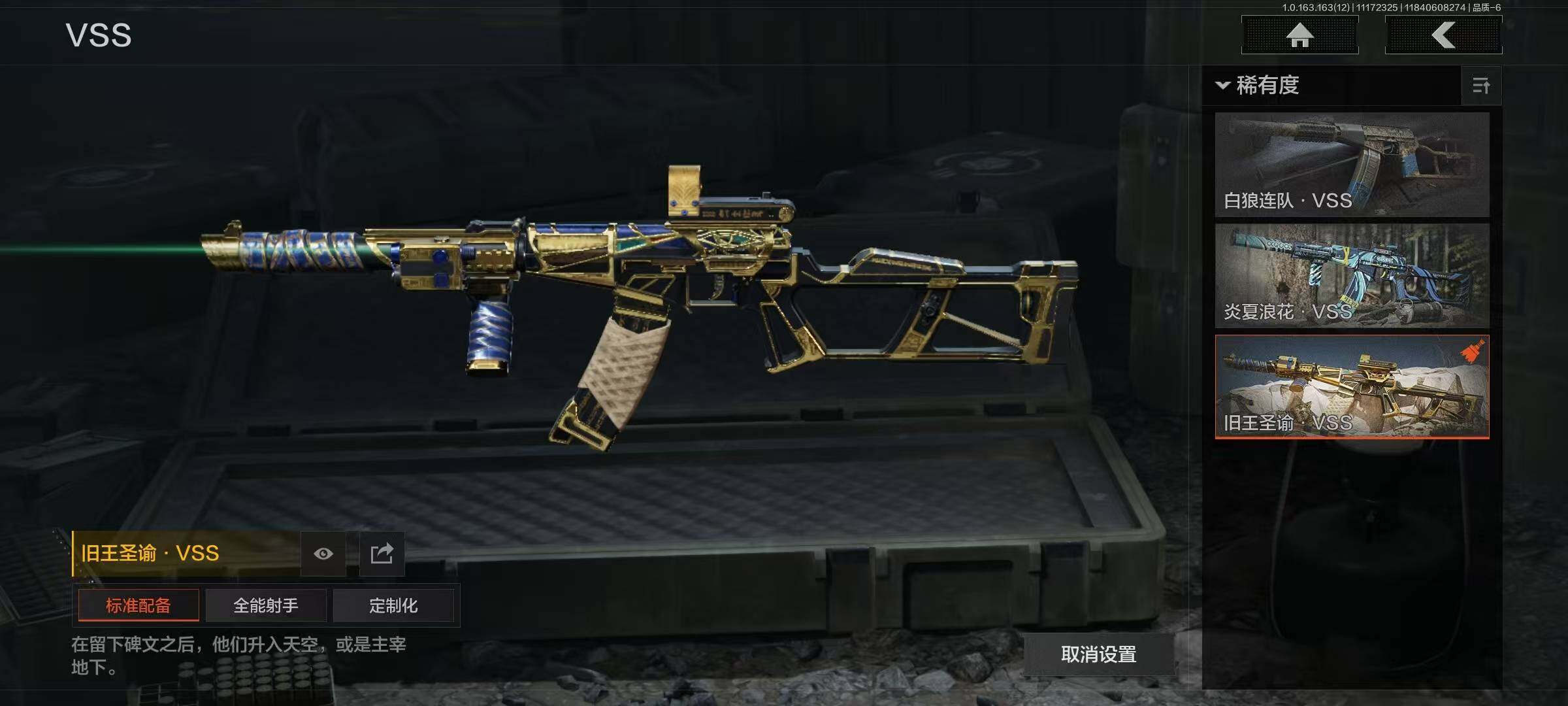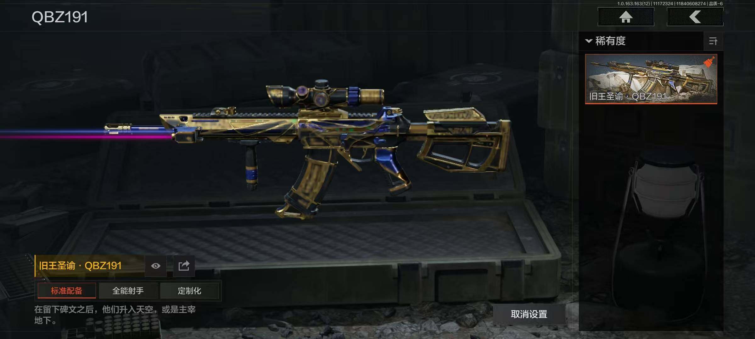 商品描述:【AQZG475】等级:30/段位:尖兵/仓库价值(百万):106/柯恩币:37169398/工兵铲/野战折刀/竞技·FAL/旗帜·AEK/旧王圣谕·VSS