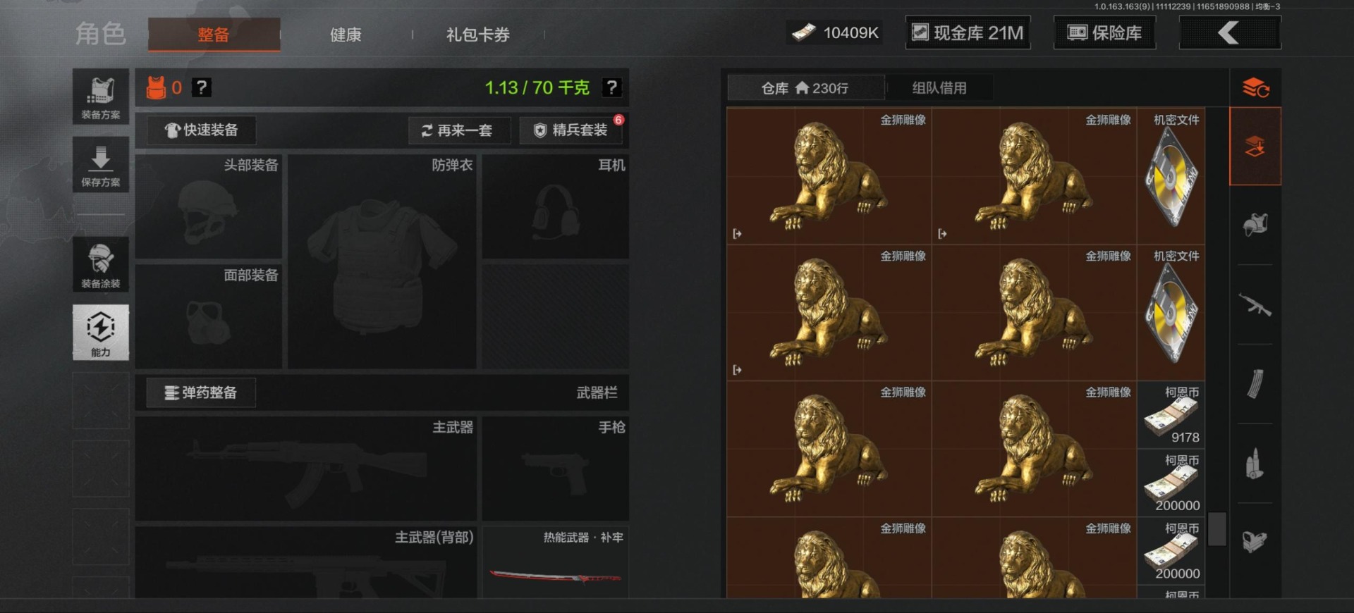 [13630734]库存价值102.7 6近战武器 2金套装 10金枪皮 可修改实名 【柯恩币数量】:3180【角色装扮(金)】:绕指玉鸾·战术甲胄,使徒·欧瑞恩【近战武器】:三尺万仞·战术剑,工兵铲,来战·开山刀,涂鸦利刃,冬日冰镐,急袭弯刀【金色枪皮】:利齿风暴·MPX,告丧夜曲·AUG,告丧夜曲·AR57,浮鳞影青·QBZ192,旧王圣谕·QBZ191,旧王圣谕·VSS,骑士之剑·VSS,长缨风掣·Vector9,长缨风掣·RPK16,长缨风掣·AX50【紫色枪皮】:棱光裂变·AK102,竞技·MDR,骑士之剑·AKS74U,炎夏浪花·H416,快乐游戏·MPX,骤羽尖啸·M4A1,秘域鎏金·RPK16,猩红羽翼·VSS,来战·AKM,德尔塔小队·M4A1,玄戈梨花·MPX,缟兵玄墨·VSS,缟兵玄墨·MPX,07式林地迷彩·QBZ191,玄戈梨花·VSS,涂绘猎人·AR57,战术大师·AK74N【角色装扮(紫)】:金狮护身·转运套装,台风IV竞技运动服DSTW1595安卓Q-等级30-仓库价值555.1k科恩币328864 【套装】 王国卫队礼装 ·轻装 都市夜影套装 台风I竞技运动服 【近战武器】 急袭弯刀 【枪皮】 旗帜·AEK 旧王圣谕·QBZ191 冬夜·AK12 利齿风暴·MPX 旧王圣谕·VSS 骑士之剑·VSS 冰河碎影·14