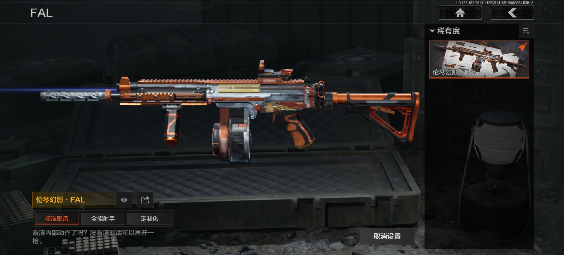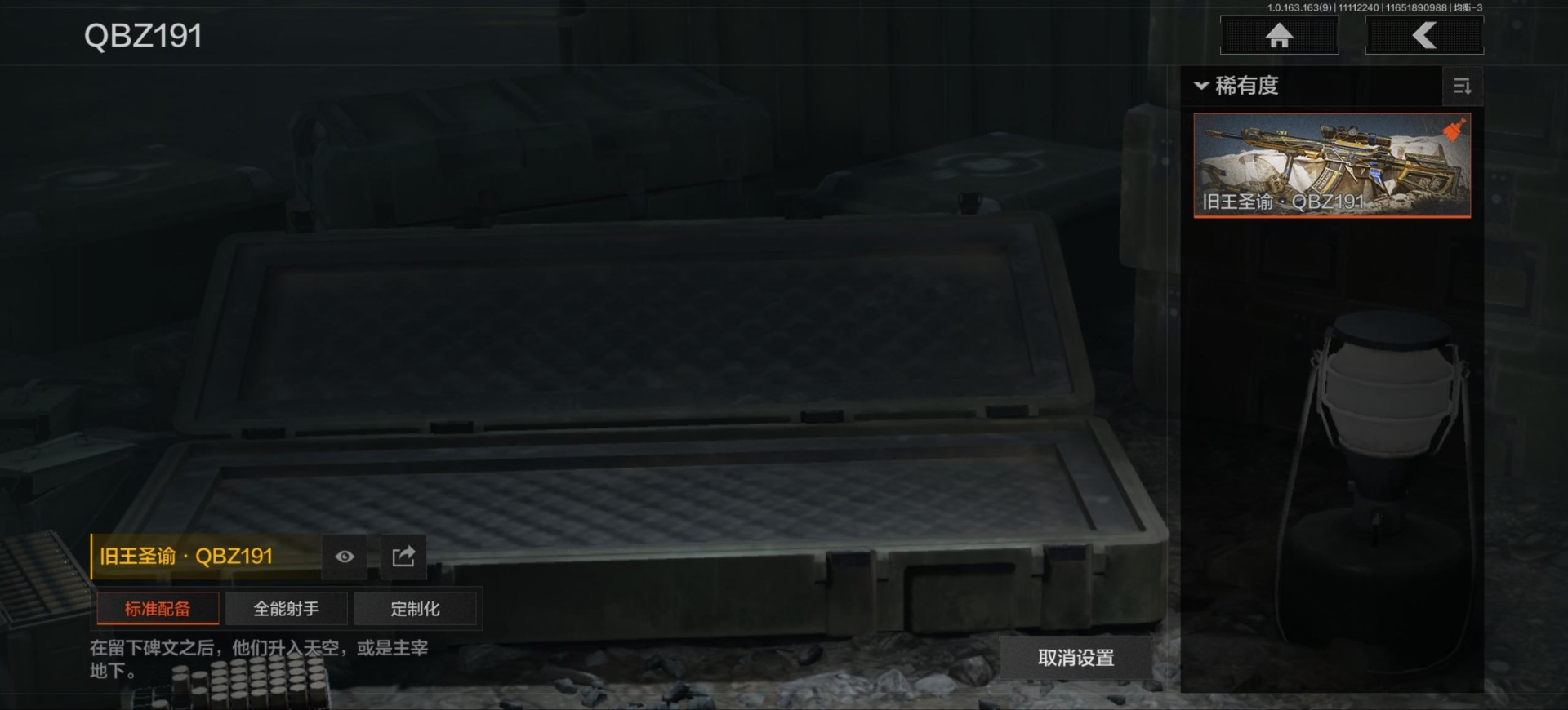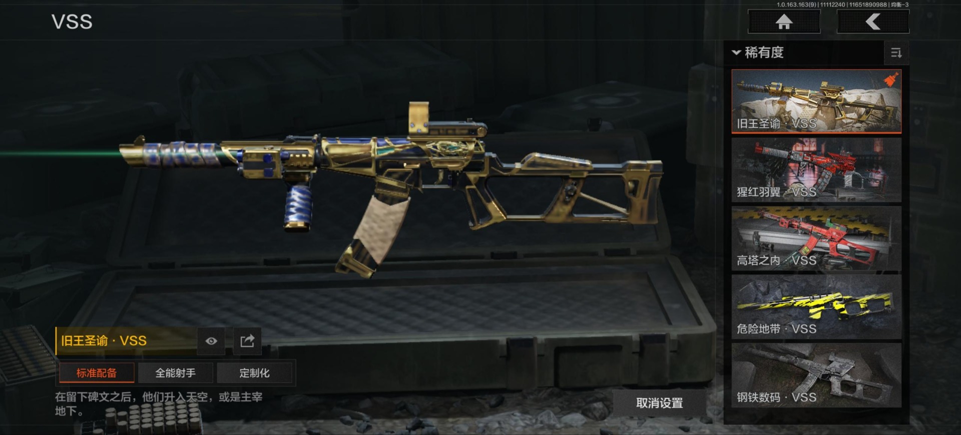 商品描述:[13644325]库存价值71.0 3近战武器 1金套装 7金枪皮 可修改实名 【柯恩币数量】:10409【角色装扮(金)】:噤声者吉利服【近战武器】:热能武器·补牢,工兵铲,来战·开山刀【金色枪皮】:利齿风暴·MPX,旗帜·AEK,棱光裂变·QBU191,告丧夜曲·AUG,伦琴幻影·FAL,旧王圣谕·QBZ191,旧王圣谕·VSS【紫色枪皮】:棱光裂变·AK102,棱光裂变·AKM,火力倾泻·AUG,高塔之内·VSS,竞技·MDR,猩红羽翼·VSS,来战·AK74N【角色装扮(紫)】:王国卫队礼装,金狮护身·转运套装,鎏金街头套装