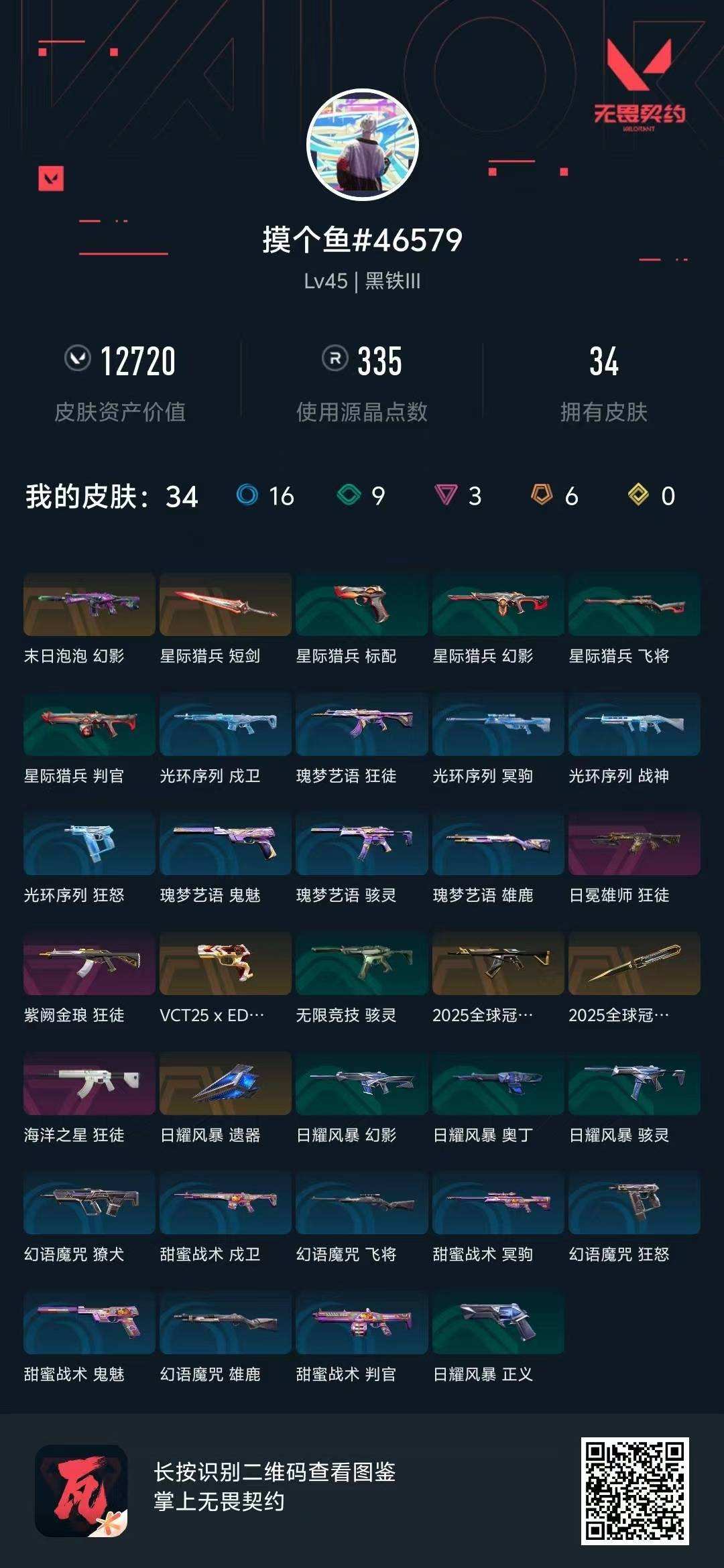 商品描述:[13737093]6橙皮 3紫皮 34皮肤 15英雄 52卡面 335已用源晶 黑铁段位 【套装】:2025全球冠军赛【近战武器皮肤】:星际猎兵 短剑,2025全球冠军赛 蝴蝶刀【佩枪皮肤】:标配-VCT25xEDG【步枪皮肤】:2025全球冠军赛 狂徒,幻影-末日泡泡,狂徒-紫阙金琅,狂徒-海洋之星,狂徒-日冕雄师【挂饰】:2025全球冠军赛挂饰,V25第三幕:黑铁 挂饰,VCTxEDG挂饰