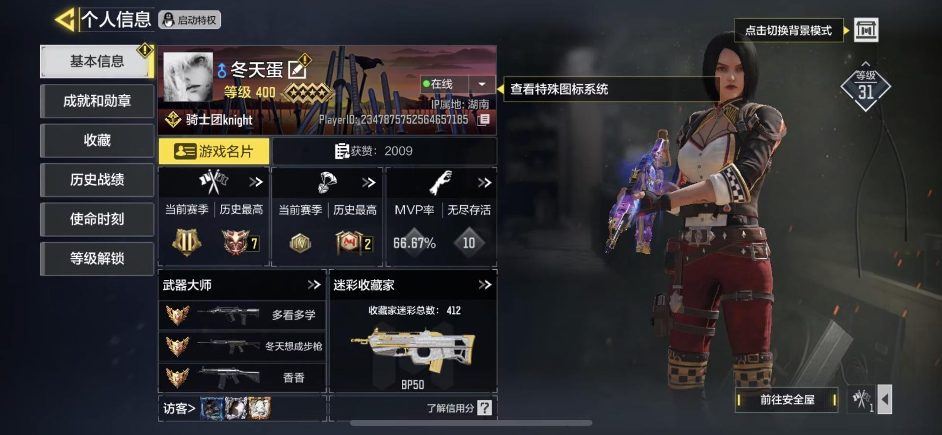 MHZ2415【7红2满12金】安卓Q-等级400-史诗枪械522 【7神话】AMR-亚特兰蒂斯(满级) Kilo 141-暗夜奏鸣曲(满级) M13-黑耀星辰 Switchblade X9-瞬影斩决 Krig6-冰霜巨龙 Fennec-无畏 AK117-熔岩 【12传说】 AN94-毁灭浪潮 十字弓-动能电流 Arctic50-青眸白虎 S36-甜心诱惑 DLQ33-先进火力 唐刀-白月魁 Type25-赤焰复仇 SA80-狂暴冲锋 电棍-永恒炽热 CR56-回音律动 AK47-火箭炮 飞翼浮游炮-v高达