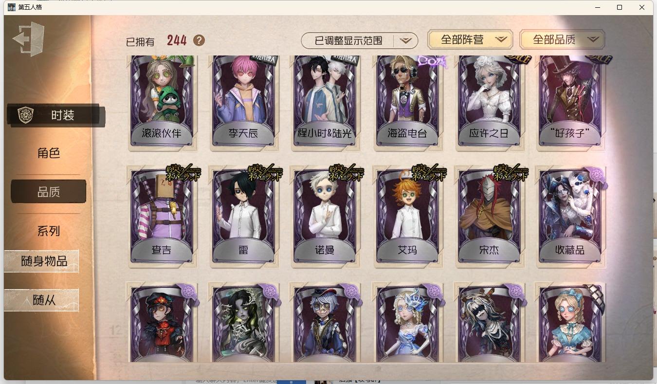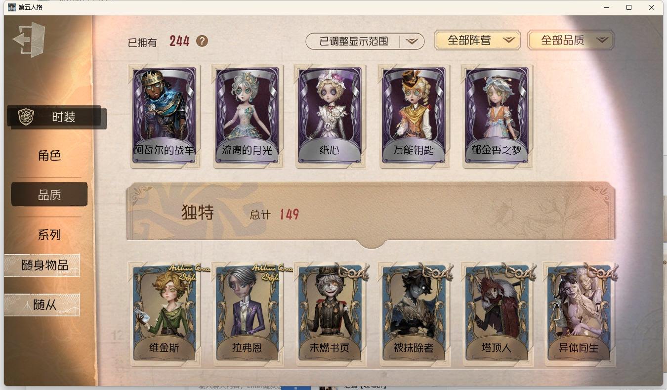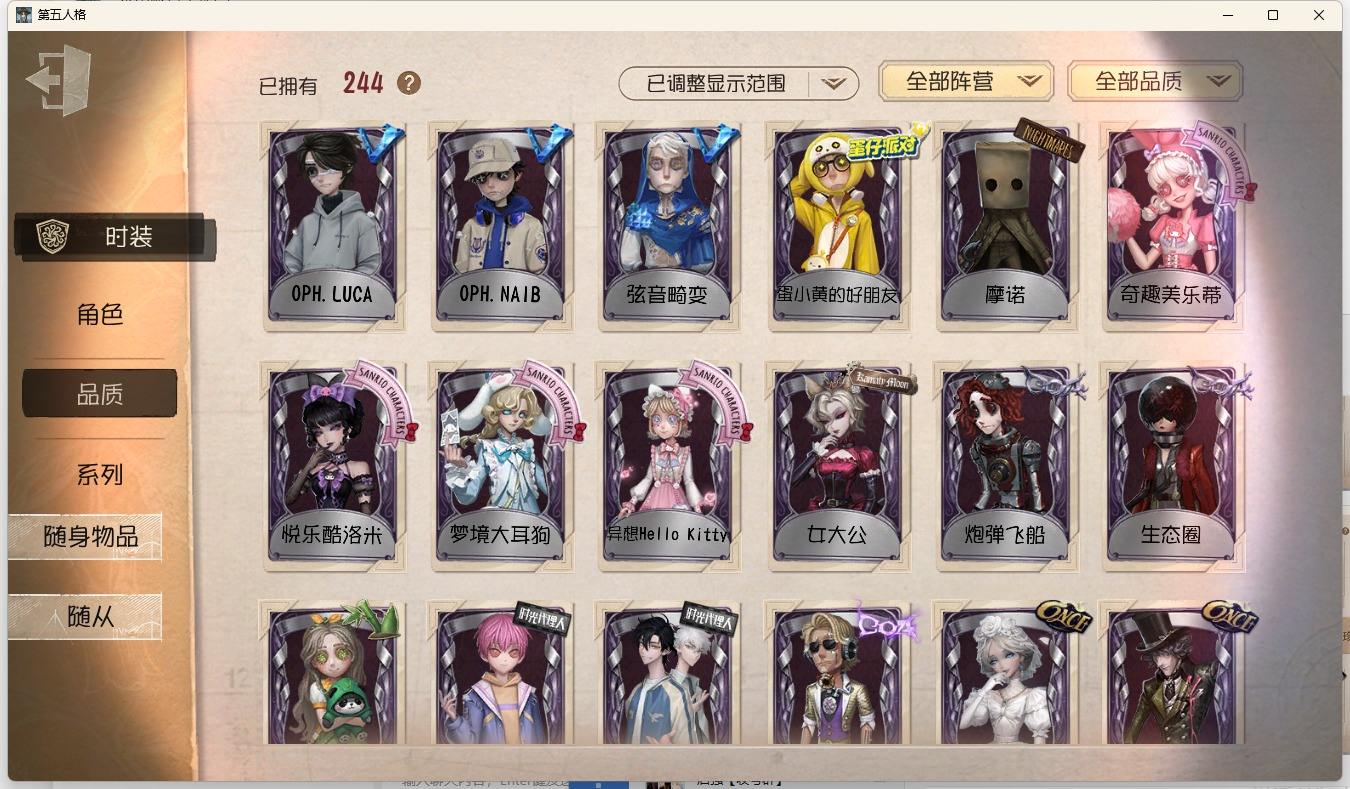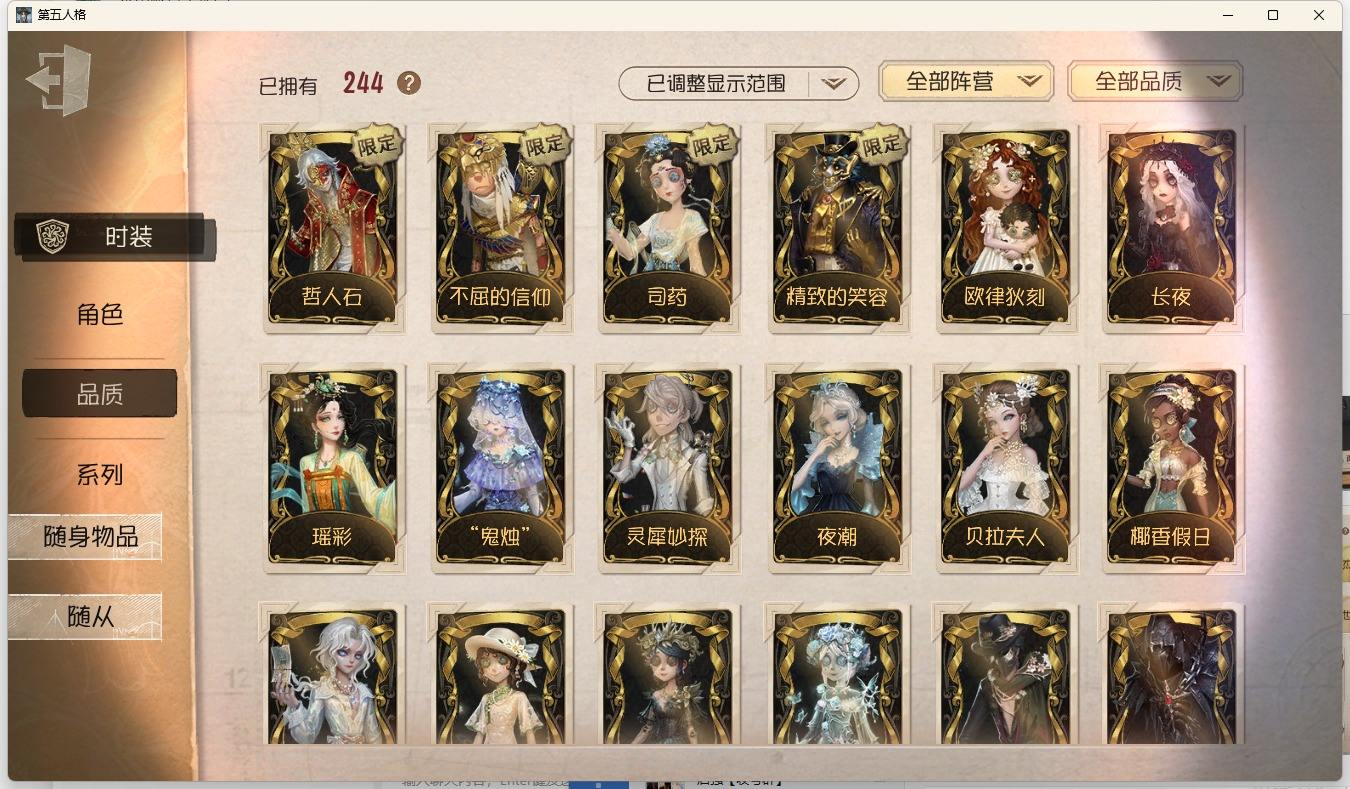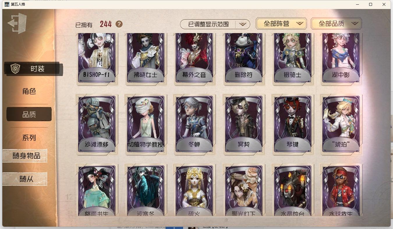 [14349997]苹果官服 邮箱账号 1虚妄杰作 243时装 13金皮 70紫皮 18随从 101随身物品 【时装】:古董商-招风旗,渔女-垂泪的神女,使徒-多加雷萨,小说家-最原终一,画家-温暖的平安夜,古董商-木兰,园丁-异想Hello Kitty,爱哭鬼-摩诺,渔女-百万人鱼,律师-亚伯拉罕·葛雷,祭司-“绯”,渔女-Chef K,古董商-填海平,邮差-秋日随想,“囚徒”-天海兰太郎,调香师-提炼师,古董商-黑鸦,咒术师-椰香假日,杂技演员-雨宫莲,杂技演员-JOKER,空军-爱神之吻,记者-伊布,红蝶-融化的泪琥珀,大副-雷斯垂德探长,雕刻家-善忘的海马体,骑士-艺术品商人,爱哭鬼-善恶的本性,教授-吟游诗人,画家-掌中篆记,26号守卫-秘密大厨,小说家-无归的昨日,冒险家-赞因,“法罗女士”-向深处求告,魔术师-动力芯,幸运儿-蛋小黄的好朋友,古董商-墨韵,宿伞之魂-桃面书生,摄影师-“琥珀”,勘探员-盛夏飞盘,“法罗女士”-VIOLET,古董商-菌丝研究,先知-纯白之盐,调酒师-逐浪的玫瑰,“法罗女士”-芳泽霞,“小女孩”-异动指针,小说家-“伊始新篇”,园丁-郁金香之梦,破轮-沙滩漂移,蜡像师-收藏品,空军-新岛真,空军-QUEEN,祭司-“朝圣者”,机械师-佐仓双叶,空军-“苏珊娜”,蜡像师-淋浴,魔术师-梅林,昆虫学者-可妮兔,“杰克”-夜来香,大副-明智吾郎,“噩梦”-随机数,红蝶-仙鹤,红蝶-彼岸,红蝶-更纱,红夫人-贝拉夫人,红蝶-竹华,舞女-高卷杏,舞女-女武神,舞女-PANTHER,调香师-致命温柔,调香师-Lady K,调香师-红菱艳,调香师-摩涅莫绪涅之梦,调香师-花序,园丁-奥村春,先知-月相,“小女孩”-年岁,前锋-坂本龙司,盲女-海西遗风,梦之女巫-川上富江,摄影师-月下绅士,入殓师-喜多川祐介【随身物品】:荣光的残像(稀世),茅龙书(稀世),夏(稀世),遗忘之花(稀世),火火火(奇珍),指挥(奇珍),海岸花环(奇珍),海之低语(奇珍),集邮册(奇珍),回旋镖(奇珍),炸药桶(奇珍),“全熟”(奇珍),凝固的声音(奇珍),漂浮(奇珍),充气海豚(奇珍),沙漠精灵(奇珍),咖啡壶(稀世),德米特里1号(奇珍),聚集哨笛(奇珍),手摇铃(奇珍),酩酊(奇珍),心海之梦(奇珍),欢呼(奇珍),糖果鬼(奇珍),秘密(奇珍),折柳(稀世),海底遗物(奇[13739442]苹果官服 邮箱账号 208时装 15金皮 63紫皮 8随从 78随身物品 【时装】:守夜人-KNIGHT-c3,破轮-胡桃夹子,勘探员-盖提亚之遗,飞行家-异相睡眠,小丑-捣蛋裘克,爱哭鬼-摩诺,作曲家-幽灵帆,舞女-西尔菲德,佣兵-中岛敦,园丁-宇宙女巫,杂技演员-茶话会,记者-华生小姐,“囚徒”-OPH.LUCA,骑士-Mentor K,教授-吟游诗人,病患-溯光,“杰克”-加里,雕刻家-善忘的海马体,邮差-华生医生,小丑-OPH.JOKER,邮差-潘塔龙,小说家-“伊始新篇”,哭泣小丑-熄灭的太阳,“法罗女士”-芳泽霞,时空之影-“有机磷”,入殓师-“温室”,“记录员”-删除符,击球手-迫降专家,哭泣小丑-炮弹飞船,勘探员-中原中也,爱哭鬼-雪上小王子,红夫人-女大公,画家-江户川乱步,红蝶-更纱,舞女-高卷杏,调酒师-海盐特调,幸运儿-双一,小丑-变脸王,魔术师-广津柳浪,梦之女巫-信使,前锋-SKULL,梦之女巫-川上富江,前锋-坂本龙司,摄影师-宿醉,“囚徒”-太宰治
