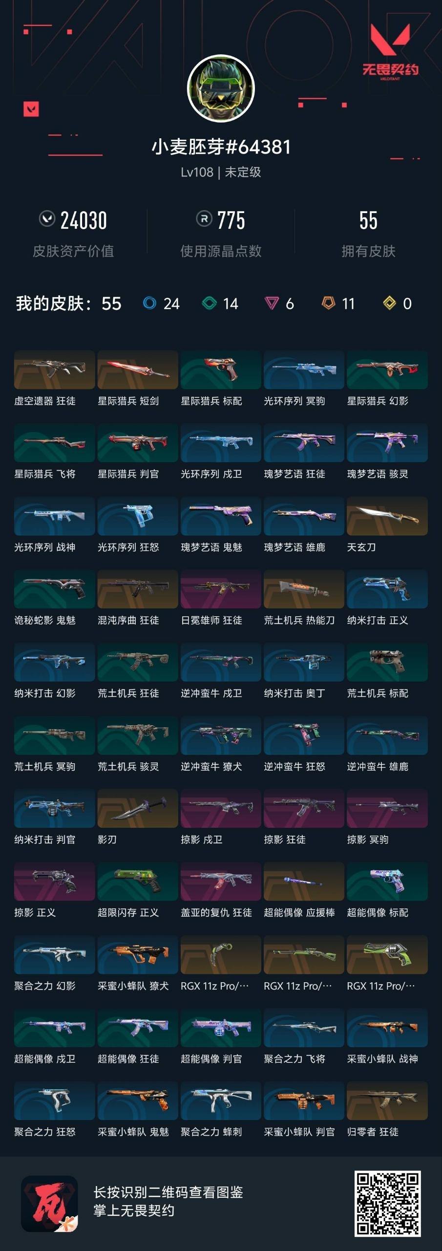 [13706220]Q191850 无畏契约/38等级/未定级段位/16英雄/22皮肤/资产15000/已使用R点355/剩余R点5/2022全球冠军赛-幻影,光明哨兵-狂徒,洪荒怒焰-狂徒,超限闪存-匕首,天御刀,夜之蝴蝶,盖世英雄-冥驹,VCT-x-BLG-标配,破败军械-鬼魅,离子武器-正义