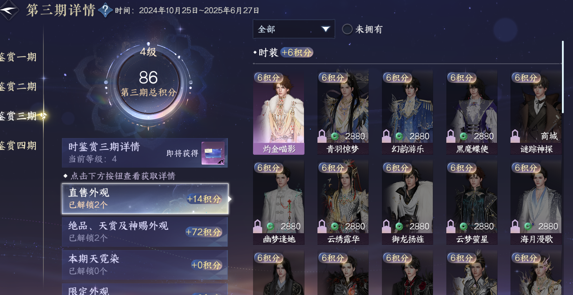 XY-076643134 战力值460477 总评460477 角色等级89 衣品值209790 国色值134400 已用天赏石29 未用天赏石0 天霓染数量9 【网易邮箱账号】 【无换绑冷却】 【素问】 【男】 【7级】 【把酒临风】 商城外观1 商城外观:云极天穹;