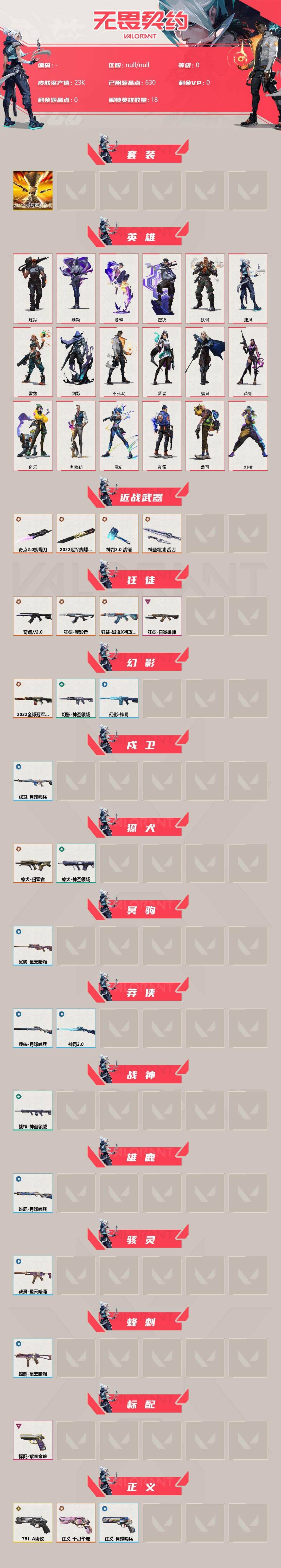 [13699047]【套装】:掠影//2.0套装【英雄】:幻棱,炼狱,维斯,暮蝶,壹决,铁臂,捷风,雷兹,幽影,不死鸟,贤者,猎枭,零,芮娜,奇乐,尚勃勒,霓虹,夜露,K/O,盖可,黑梦,钢锁【近战 武器】:近战武器-影钩【狂徒】:狂徒-盖世英雄【幻影】:幻影-掠影//2.0【冥驹】:冥驹-末日泡泡【奥丁】:奥丁-掠影//2.0【骇灵】:骇灵-掠影//2.0【鬼魅】:鬼魅-掠影//2.0,鬼魅-诡秘蛇影,鬼魅-星云暗涌【卡面】:铁之华 卡面,梦幻奶茶 卡面,零点嗅探设计图 卡面,别冒尖 卡面,代号红色 卡面,新兵报到 卡面,V契约 卡面,无畏契约 卡面【喷漆】:无畏契约GO!第一卷:贤者 喷漆,暴走萝莉 喷漆,胜利属于无畏契约 喷漆,GLHF 喷漆,无畏契约 喷漆【挂饰】:《双城之战》魄罗 挂饰,无畏契约 纪念币 挂饰[13769311]5橙皮 3紫皮 33皮肤 27英雄 70卡面 490已用源晶 白银段位 【近战武器皮肤】:匕首-超限闪存,机动狂飙战刀,超能偶像 应援棒【冲锋枪皮肤】:骇灵-离子武器2.0【步枪皮肤】:狂徒-奇点//2.0,狂徒-掠影,狂徒-盖亚的复仇,狂徒-全息波普//2.0【挂饰】:超能偶像挂饰,袖珍捷风挂饰,双城之战小蛋糕挂饰,神中神挂饰,糖葫芦挂饰,终章KO小金人挂饰