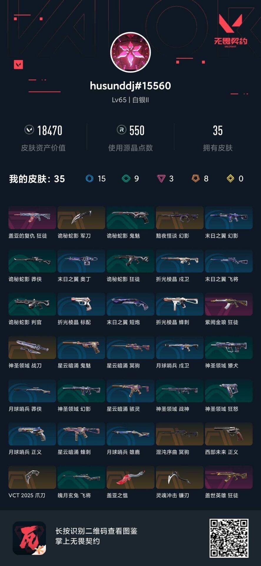 商品描述:[14589856]8橙皮 3紫皮 35皮肤 17英雄 61卡面 550已用源晶 白银段位 【套装】:VCTCN2025套装,VCT 2025赛季礼包【近战武器皮肤】:诡秘蛇影,VCT 2025 爪刀,神圣领域 战刀,盖亚之愠,镰刃-灵魂冲击【佩枪皮肤】:正义-西部未来【步枪皮肤】:幻影-黯夜怪谈,狂徒-紫阙金琅,狂徒-盖亚的复仇,狂徒-盖世英雄【狙击枪皮肤】:冥驹-混沌序曲【挂饰】:双城之战魄罗挂饰,金属蝶翼挂饰,神中神挂饰,VCT2025CN联赛挂饰,VCT2025太平洋联赛挂饰,VCT2025美洲联赛挂饰,VCT2025EMEA联赛挂饰,幸运中国结挂饰