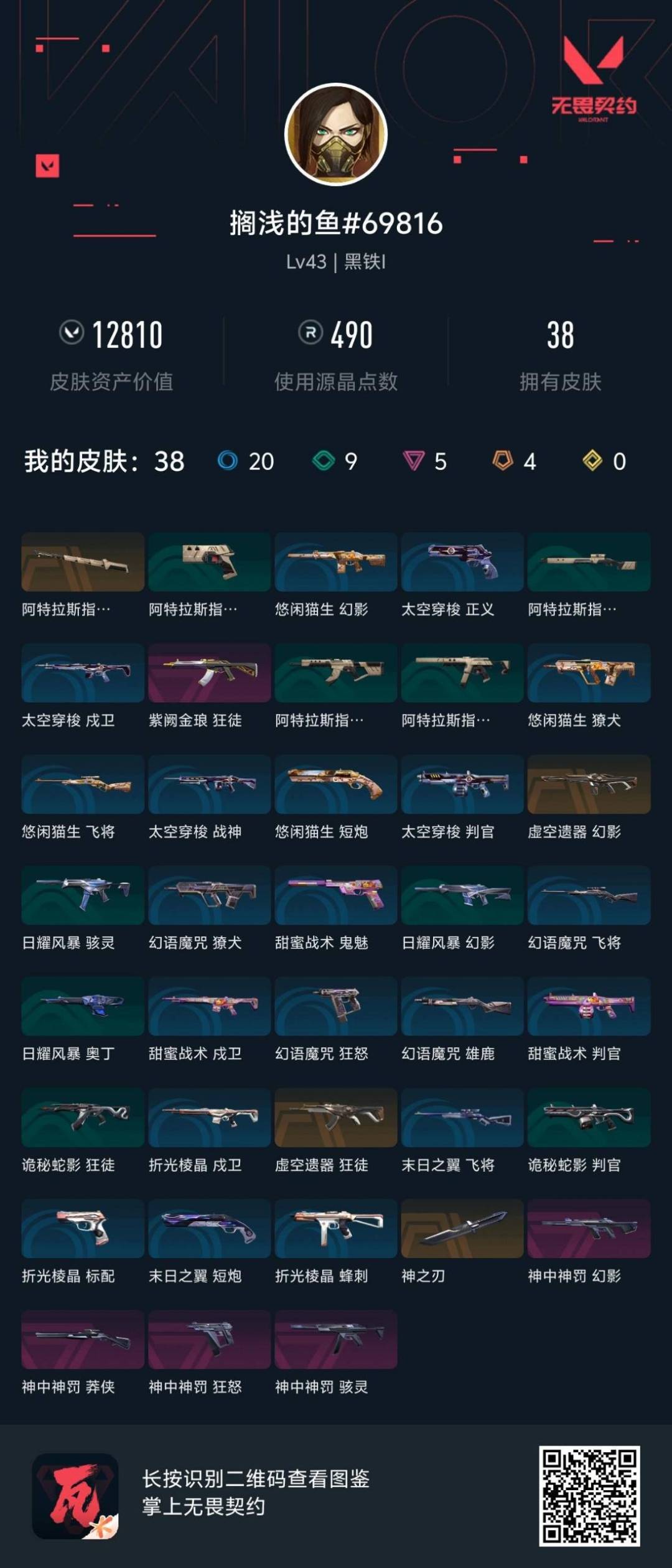 [13706220]Q191850 无畏契约/38等级/未定级段位/16英雄/22皮肤/资产15000/已使用R点355/剩余R点5/2022全球冠军赛-幻影,光明哨兵-狂徒,洪荒怒焰-狂徒,超限闪存-匕首,天御刀,夜之蝴蝶,盖世英雄-冥驹,VCT-x-BLG-标配,破败军械-鬼魅,离子武器-正义