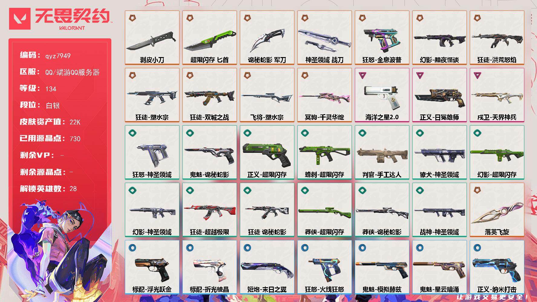 商品描述:白银1-剥皮小刀-塑水宗-狂徒-黯夜怪谈-幻影-洪荒怒焰-狂徒-塑水宗-飞将-落英飞旋-千灵华绽-冥驹-双城之战-狂徒-多热门带双城联动-不欠r点小毕业号-qyz7949-近战武器皮肤:-剥皮小刀,落英飞旋,匕首-超限闪存,神圣领域-战刀,诡秘蛇影-步枪皮肤:-戍卫-天界神兵,狂徒-塑水宗,狂徒-洪荒怒焰,幻影-黯夜怪谈,狂徒-双城之战-佩枪皮肤:-狂怒-全息波普,正义-日冕雄师,标配-海洋之星20-狙击枪皮肤:-飞将-塑水宗,冥驹-千灵华绽-亮点:-【qyz7949】【英雄】:幻棱,炼狱,维斯,暮蝶,钛狐,壹决,铁臂,捷风,雷兹,幽影,不死鸟,贤者,猎枭,蝰蛇,零,芮娜,奇乐,尚勃勒,霓虹,斯凯,夜露,星礈,K/O,海神,盖可,黑梦,钢锁【近战-武器】:近战武器-剥皮小刀,近战武器-落英飞旋,近战武器-超限闪存-匕首,近战武器-诡秘蛇影-军刀,近战武器-神圣领域-战刀【狂徒】:狂徒-洪荒怒焰,狂徒-双城之战,狂徒-塑水宗,狂徒-超越极限,狂徒-诡秘蛇影【幻影】:幻影-黯夜怪谈,幻影-超限闪存,幻影-神圣领域,幻影-末日之翼【戍卫】:戍卫-天界神兵,戍卫-浮光跃金,戍卫-月球哨兵,戍卫