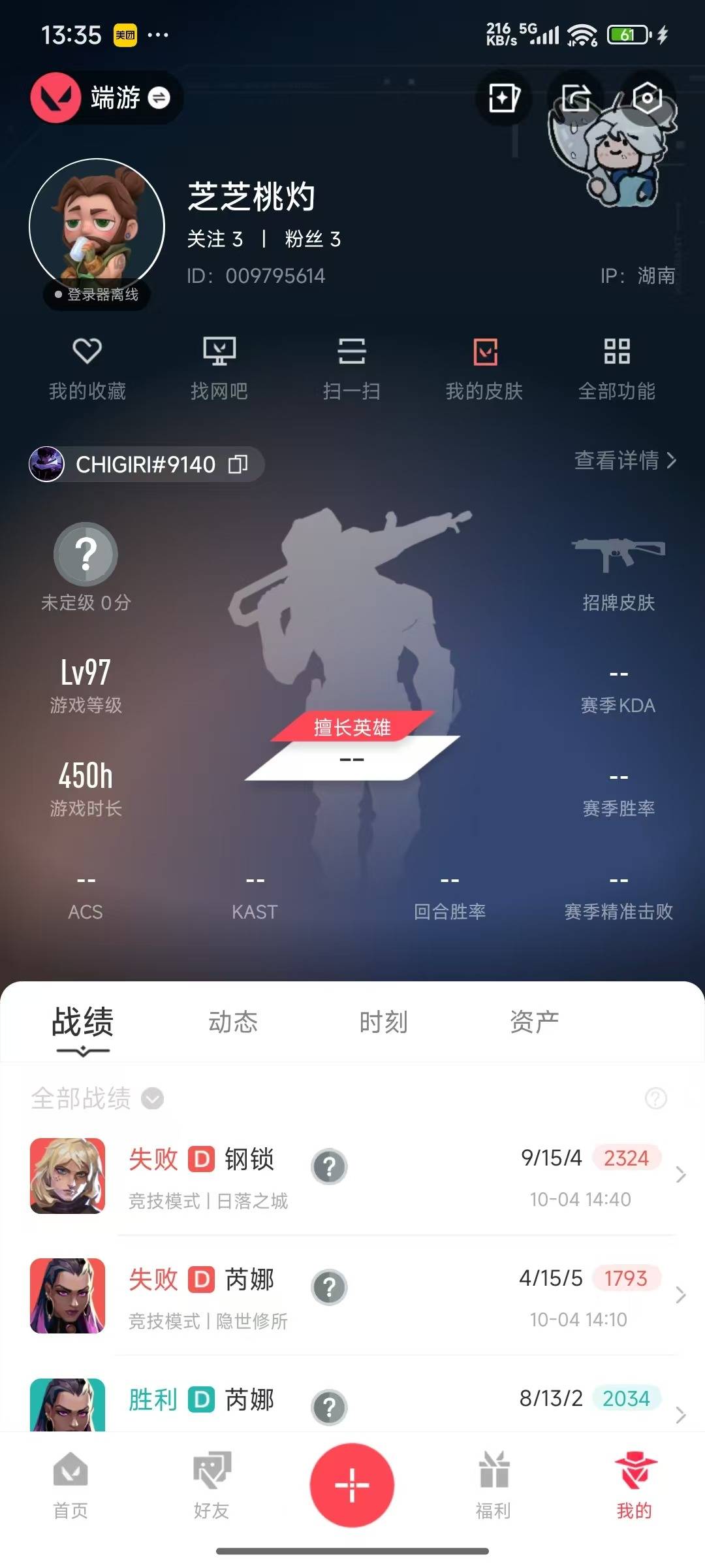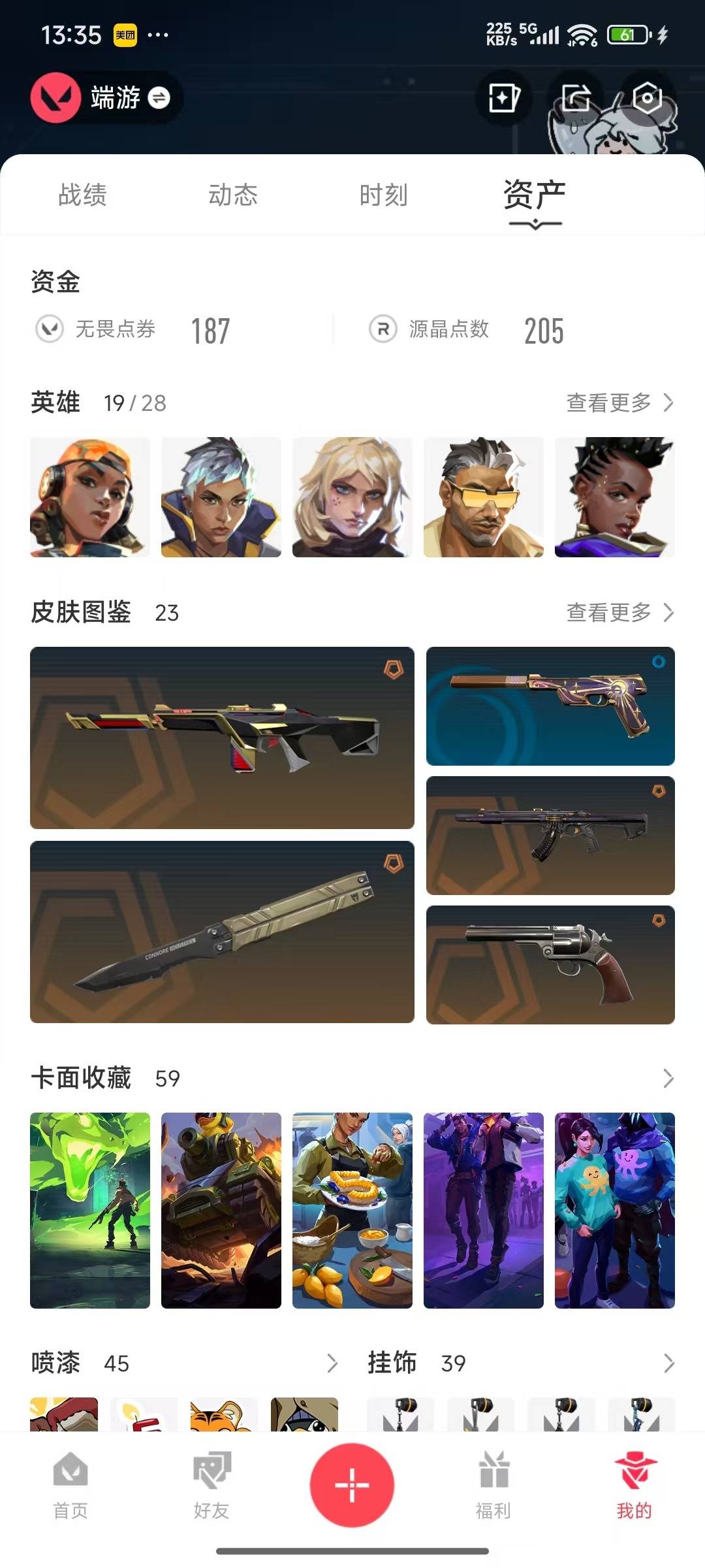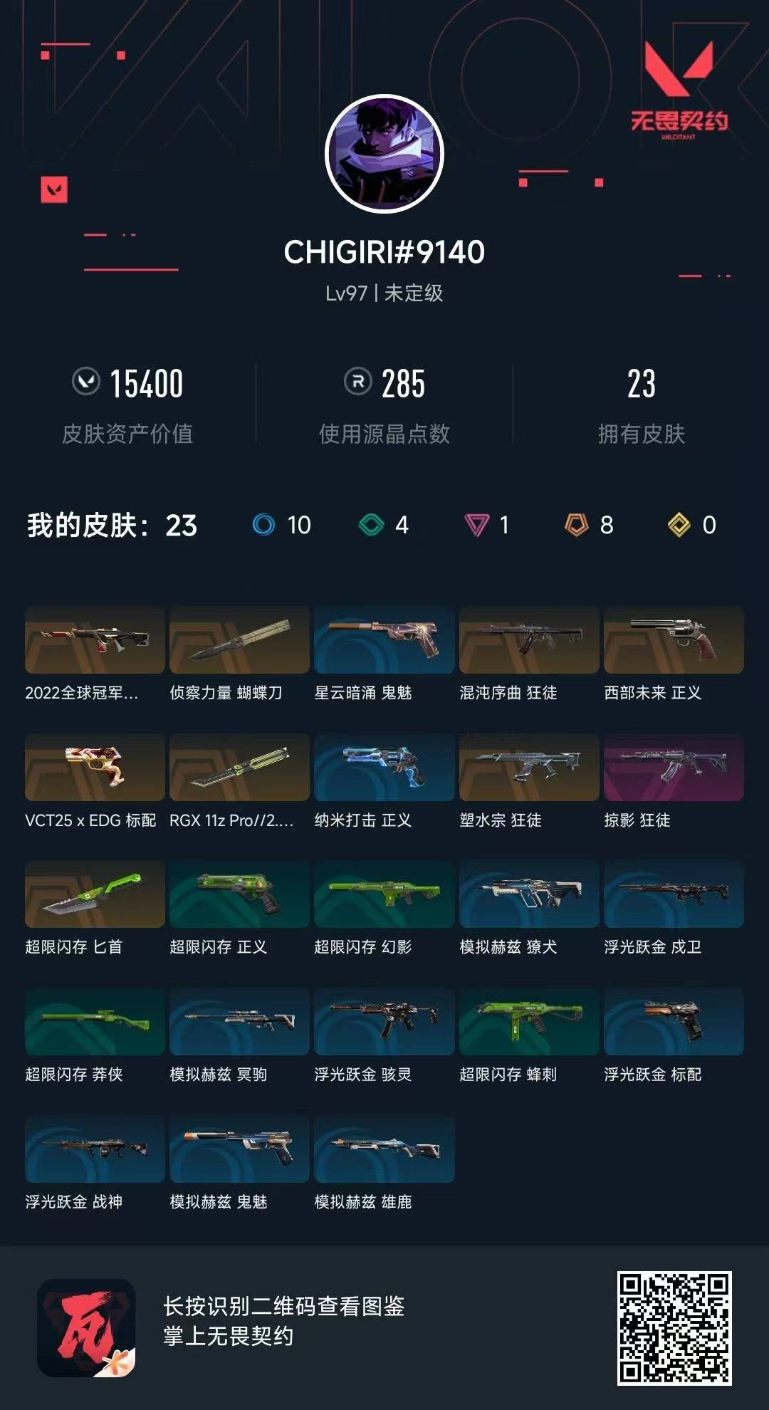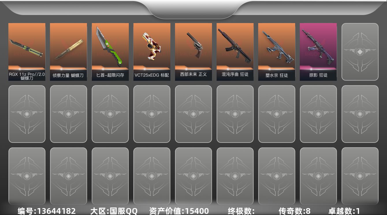 [13644182]8橙皮 1紫皮 23皮肤 19英雄 59卡面 285已用源晶 未定级段位 【近战武器皮肤】:RGX 11z Pro//2.0 蝴蝶刀,匕首-超限闪存,蝴蝶刀-侦察力量【佩枪皮肤】:标配-VCT25xEDG,正义-西部未来【步枪皮肤】:狂徒-掠影,狂徒-混沌序曲,狂徒-塑水宗【挂饰】:鱼骨头挂饰,双城之战小蛋糕挂饰,源晶工程挂饰,神中神挂饰,VCTxEDG挂饰,终章KO小金人挂饰