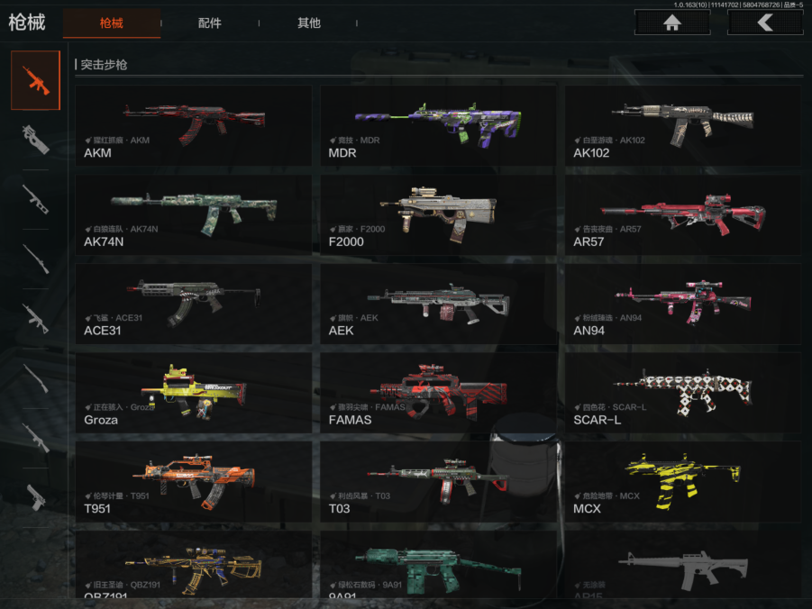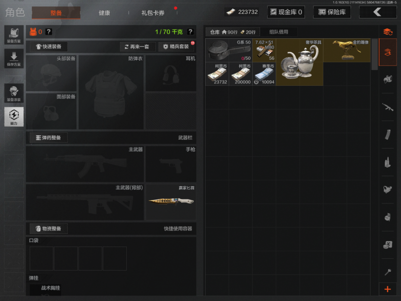 AQ393安Q-可二次-仓库价值:2.2M 科恩币: 525170 3刀皮: S-07折刀 工兵铲 来战·开山刀 金枪: 伦琴幻影· FAL 骑士之剑·VSS 武器: 来战·AKM 自喷网络·H416 北国内卫·MDR 鱼跃丹青·AK102 战术大师·AK74N 骑士之剑·AKS74U 火力倾泻·AUG 战术大师·AEK 幻象·FAMAS 典礼武器·MCX 利齿风暴·MPX 典礼武器·14