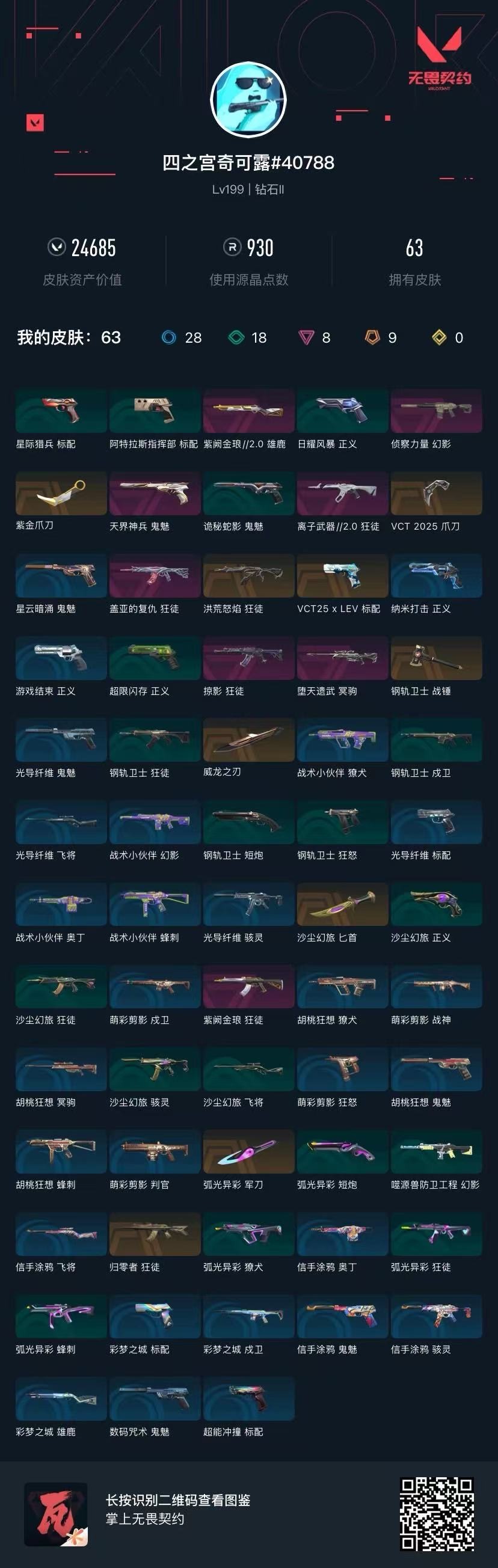 商品描述:[13695951]9橙皮 8紫皮 63皮肤 28英雄 164卡面 930已用源晶 钻石段位 【套装】:VCT 2025赛季礼包,VCTCN2025套装 【近战武器皮肤】:战锤-钢轨卫士,VCT 2025 爪刀,紫金爪刀,威龙之刃,匕首-沙尘幻旅,军刀-弧光异彩 【佩枪皮肤】:标配-VCT25xLEV,鬼魅-天界神兵 【霰弹枪皮肤】:雄鹿-紫阙金琅2.0 【步枪皮肤】:狂徒-离子武器2.0,狂徒-掠影,狂徒-紫阙金琅,狂徒-洪荒怒焰,狂徒-盖亚的复仇,狂徒-归零者,幻影-侦察力量 【狙击枪皮肤】:冥驹-堕天遗武 【挂饰】:薰衣草之心挂饰,袖珍捷风挂饰,传世莲华挂饰,科尔宾之光挂饰,鱼骨头挂饰,双城之战小蛋糕挂饰,双城之战魄罗挂饰,源晶工程挂饰,神中神挂饰,VCT2025EMEA联赛挂饰,VCT2025太平洋联赛挂饰,VCT2025美洲联赛挂饰,VCT2025CN联赛挂饰,魄月玄兔挂饰,VCTxLEV挂饰,针织蜜蜂挂饰,星荷璀璨挂饰,冬日絮语挂饰,蓄势待滚挂饰,幸运中国结挂饰,迷你机甲挂饰,高音谱号挂饰,终章KO小金人挂饰,飞刀挂饰