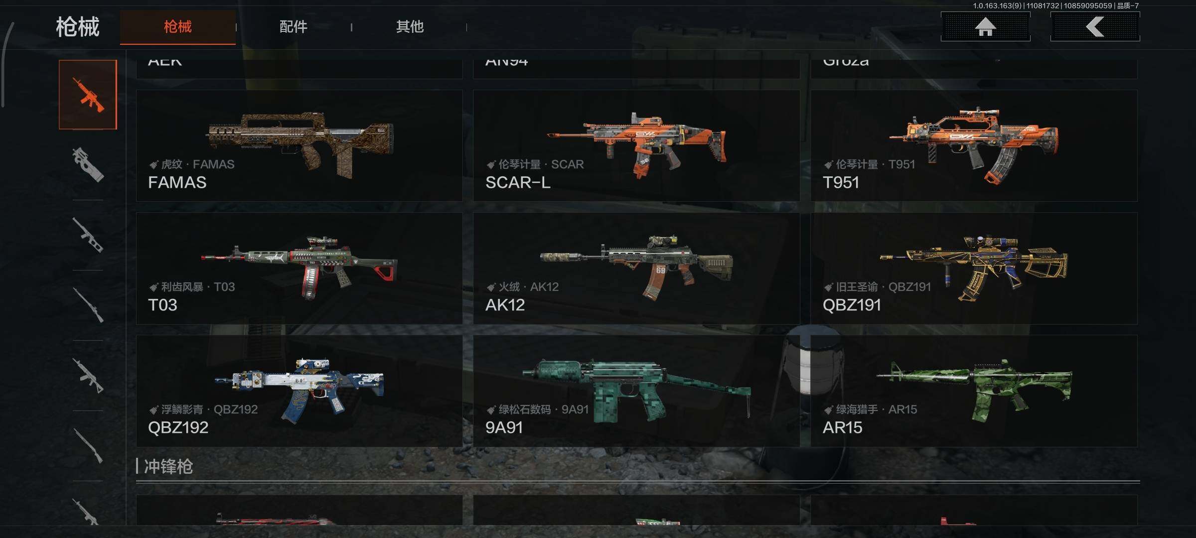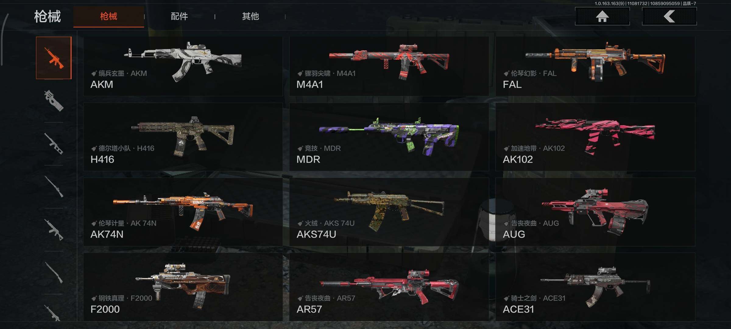 商品描述:[13677359]58M/使徒·欧瑞恩/收割者/来战·开山刀/缟兵玄墨:AKM/骤羽尖啸·M4A1/伦琴幻影·FAL/告丧夜曲:AUG