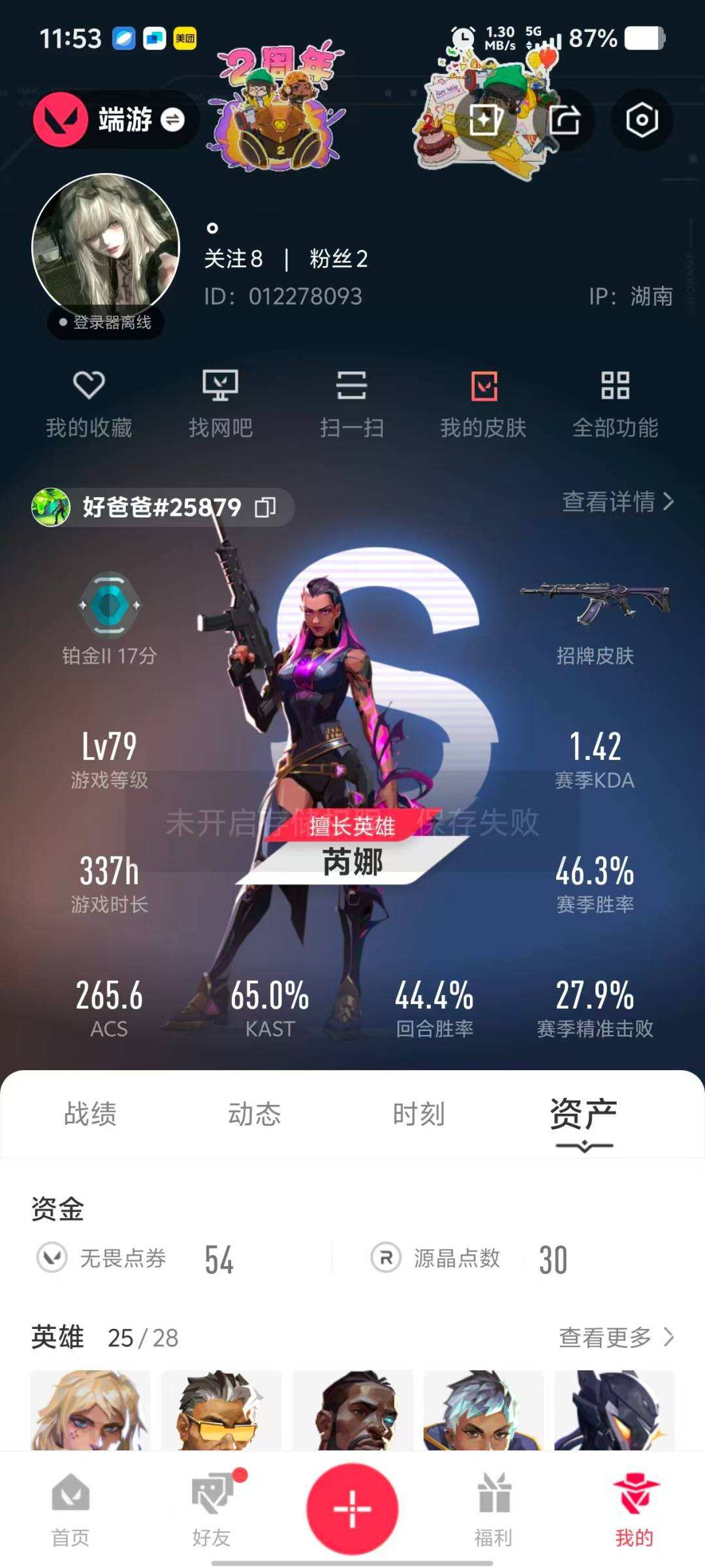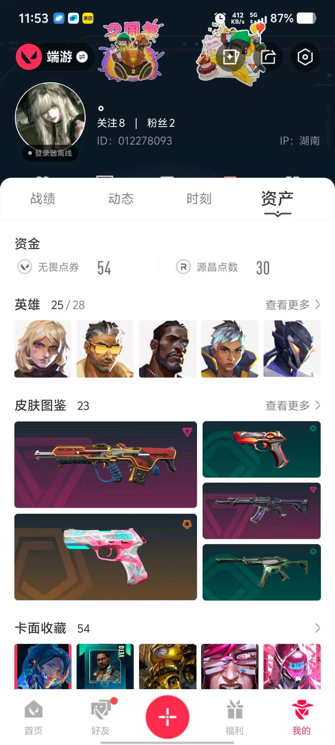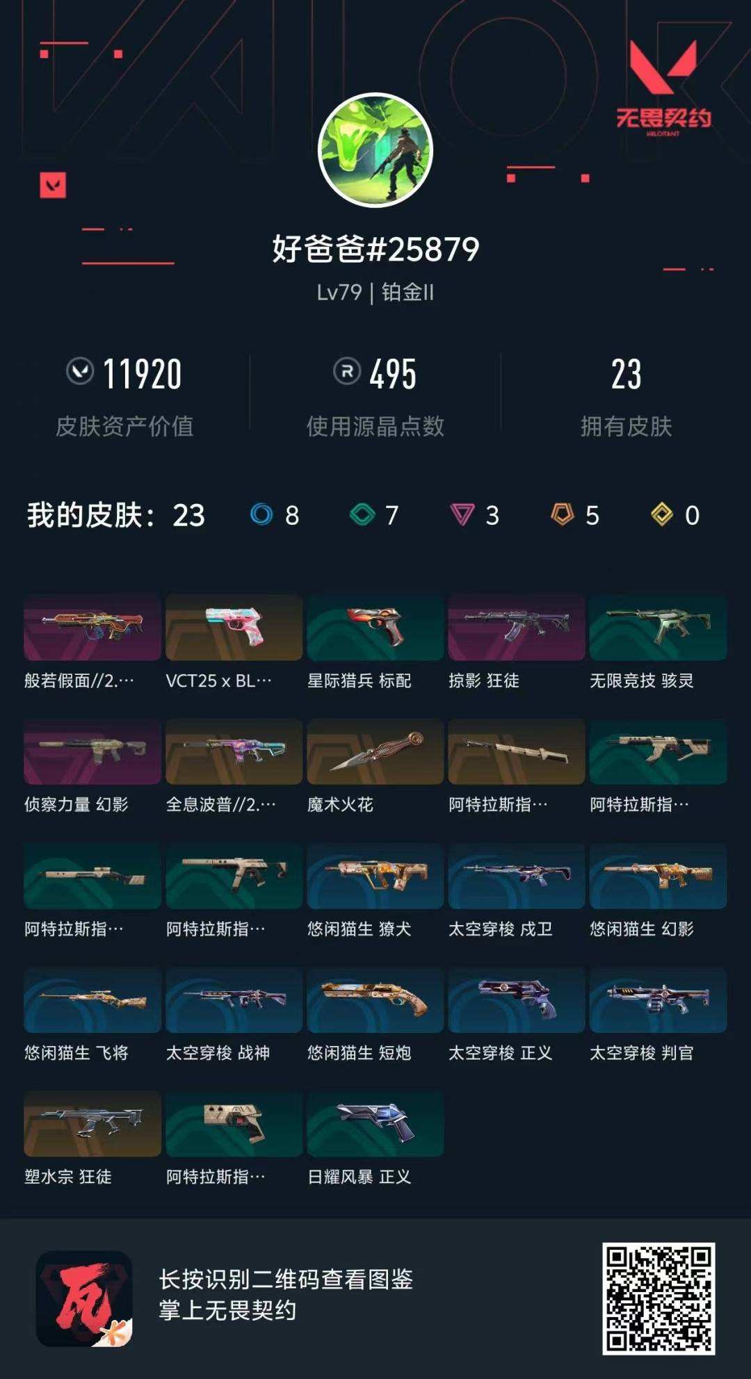 [13644182]8橙皮 1紫皮 23皮肤 19英雄 59卡面 285已用源晶 未定级段位 【近战武器皮肤】:RGX 11z Pro//2.0 蝴蝶刀,匕首-超限闪存,蝴蝶刀-侦察力量【佩枪皮肤】:标配-VCT25xEDG,正义-西部未来【步枪皮肤】:狂徒-掠影,狂徒-混沌序曲,狂徒-塑水宗【挂饰】:鱼骨头挂饰,双城之战小蛋糕挂饰,源晶工程挂饰,神中神挂饰,VCTxEDG挂饰,终章KO小金人挂饰