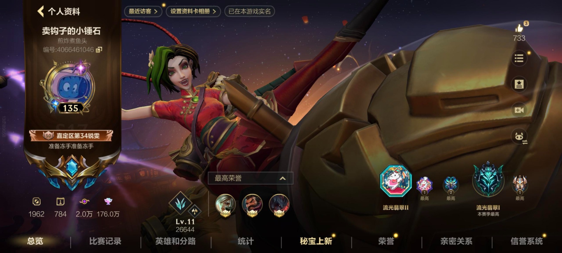 [13724249]1典藏 7神话 11限定 53传说 233史诗 406皮肤 可二次 可修改实名 【段位】:翡翠 【典藏皮】:超武乾坤:虹影 【神话皮】:夜星流火 金克丝,臻藏 翩翩绣蕊 霞,雷霆神兵 沃利贝尔,至臻锐雯,灰烬骑士派克,至臻心之钢永恩,龙的传人 【限定皮肤】:龙的传人,斩星魔剑,星之守护者霞,星之守护者洛,神龙烈焰金克丝,张辽文远,水晶玫瑰皇子,美猴王,水晶玫瑰永恩,水晶玫瑰蔚,关羽云长 【传说皮】:暗星尊,光电璀璨泽丽,水晶玫瑰 卡莎,神龙尊者 圣龙 李青,御风墨影 亚索,斗魂觉醒 莎弥拉,黎明使者德莱文,光影巨翼亚托克斯,源计划:毁灭,魔女伊芙琳,心之钢凯隐,灵魂莲华腕豪,星之守护者卡莎,星之守护者 阿卡丽,西部魔影 永恩,水晶玫瑰 凯特琳,水晶玫瑰 阿狸,天棱快晴 伊泽瑞尔,神龙尊者 昼日真龙 亚索,北极星神 黛安娜,霸天零式塞恩,斗魂无双亚索,西部魔影卢锡安,天煞劫,神王诺手,神王盖伦,神拳盲僧,神龙尊者 驭风啸龙,欧米伽小队 幽灵特工,女主播风女,律政大亨,炼狱魔犬,黎明使者锐雯,K/DA ALLOUT萨勒芬妮,黑夜使者亚索,光明哨兵薇恩,灌篮高手,福牛守护者女枪,西部天使寒冰,太空律动机器人,跳跳倩影女枪,光明哨兵格雷福斯,暗星女王拉克丝,源计划:泯灭,源计划:林,黎明使者永恩,星之守护者金克丝,战斗学院ez,源计划:联合,源计划:净化,星之守护者 陨,星之守护者 落,星之守护者阿狸