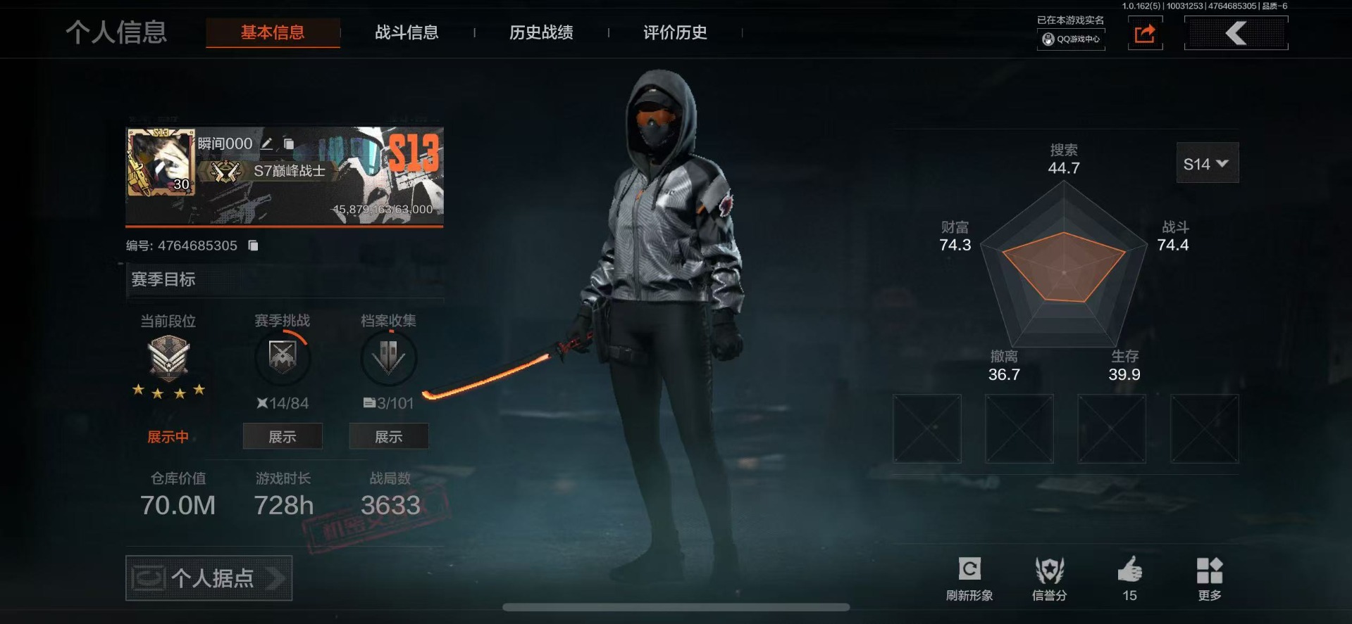 商品描述:库存价值70 2近战武器 2金枪皮 可修改实名 【柯恩币数量】:3377【近战武器】:热能武器·补牢,工兵铲【金色枪皮】:利齿风暴·MPX,旧王圣谕·QBZ191【紫色枪皮】:鱼跃丹青·T85,竞技·MDR,竞技·M110,利齿风暴·T03,利齿风暴·T79,猩红羽翼·VSS,龙威·MP5【角色装扮(紫)】:鎏金街头套装,速降反光·户外运动套装