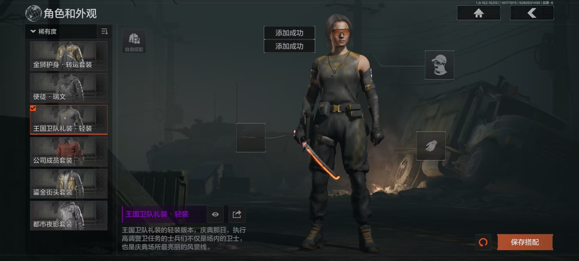 呀16:仓库价值:58.1M 科恩币:400350 4金枪19紫 机密文件DSTW1595安卓Q-等级30-仓库价值555.1k科恩币328864 【套装】 王国卫队礼装 ·轻装 都市夜影套装 台风I竞技运动服 【近战武器】 急袭弯刀 【枪皮】 旗帜·AEK 旧王圣谕·QBZ191 冬夜·AK12 利齿风暴·MPX 旧王圣谕·VSS 骑士之剑·VSS 冰河碎影·14