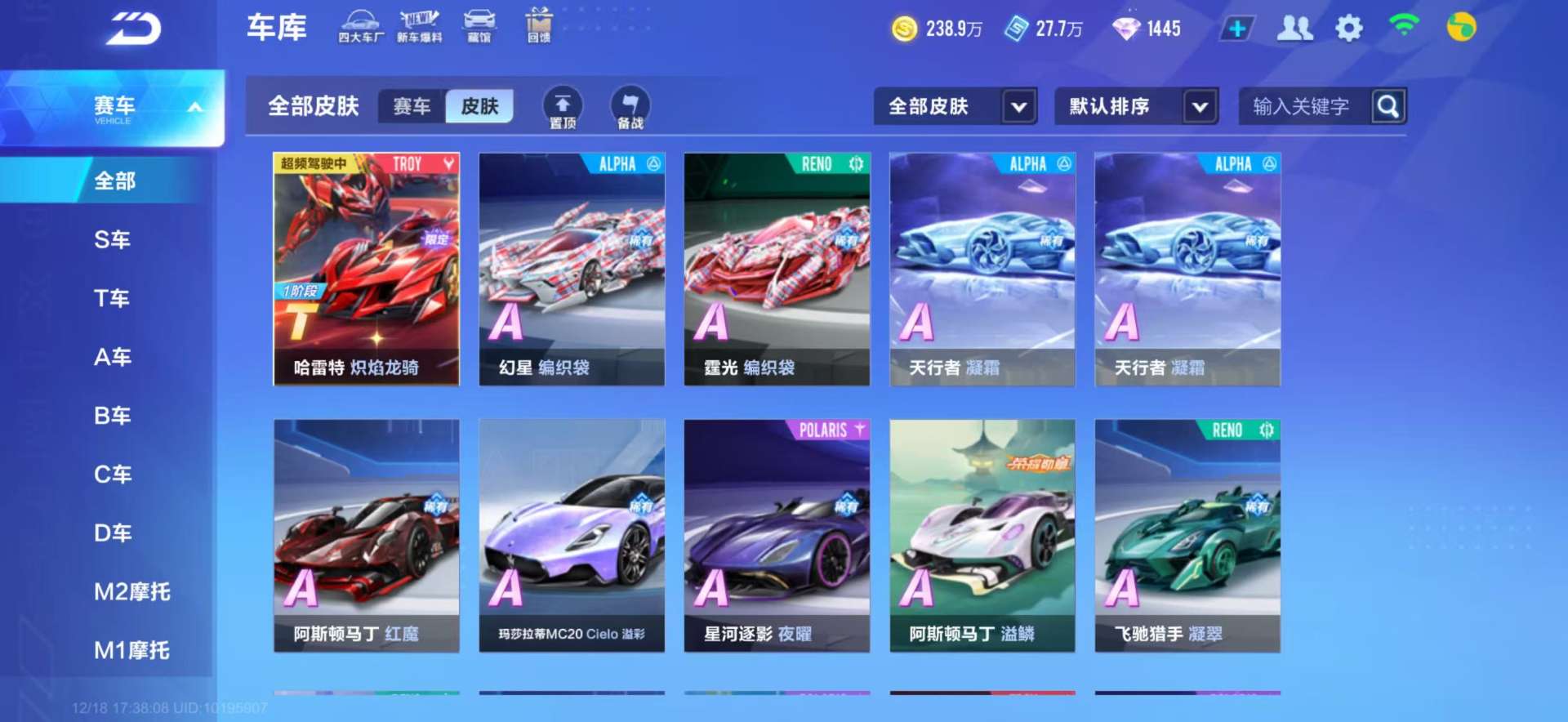 BZ643389 【双强联赛顶级皮肤-S幻星(冰晶),S追光者/永久T车-鸭宝超人/魔法套装-龙吟男装/宠物-竞速道具俱全/男女多套装服饰】 A车数量46 游戏等级82 车皮肤数量12 T车数量1 【否】 【可二次实名】 【永久包赔】 【安卓QQ】 稀有车型2 稀有永久A车2 永久T车1 稀有车型:双生战神,追光者; 稀有永久A车:龙珏雷诺,幻星; 永久T车:鸭宝超人;