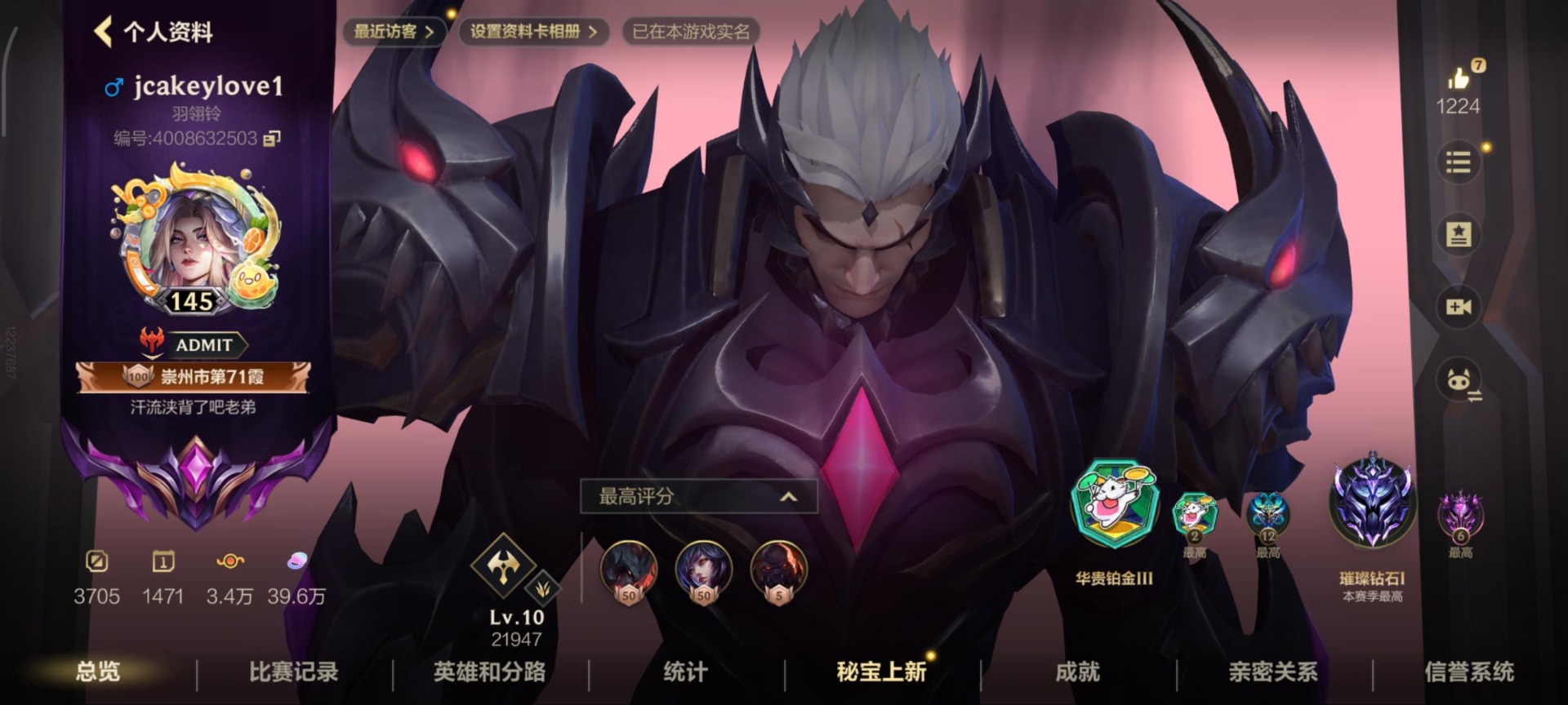 [13737709]2神话 10限定 25传说 113史诗 210皮肤 可二次 可修改实名 【段位】:黄金 【神话皮】:灰烬骑士派克,龙的传人 【限定皮肤】:龙的传人,鸡里奥,星之守护者霞,星之守护者洛,水晶玫瑰皇子,美猴王,水晶玫瑰永恩,水晶玫瑰锐雯,涂鸦小队莎弥拉,山海绘卷剑魔 【传说皮】:暗星尊,心之钢凯隐,魄炼九幽 派克,双城之战:殊途 杰斯,西部天使寒冰,西部魔影卢锡安,天煞劫,神王诺手,神王盖伦,神拳盲僧,神龙尊者 驭风啸龙,欧米伽小队 幽灵特工,炼狱魔犬,黎明使者锐雯,黑夜使者亚索,福牛守护者女枪,星之守护者金克丝,斗魂无双亚索,源计划:泯灭,黎明使者永恩,涂鸦小队莎弥拉,灵魂莲华锤石,驯龙炮手,星之守护者 陨,星之守护者 落