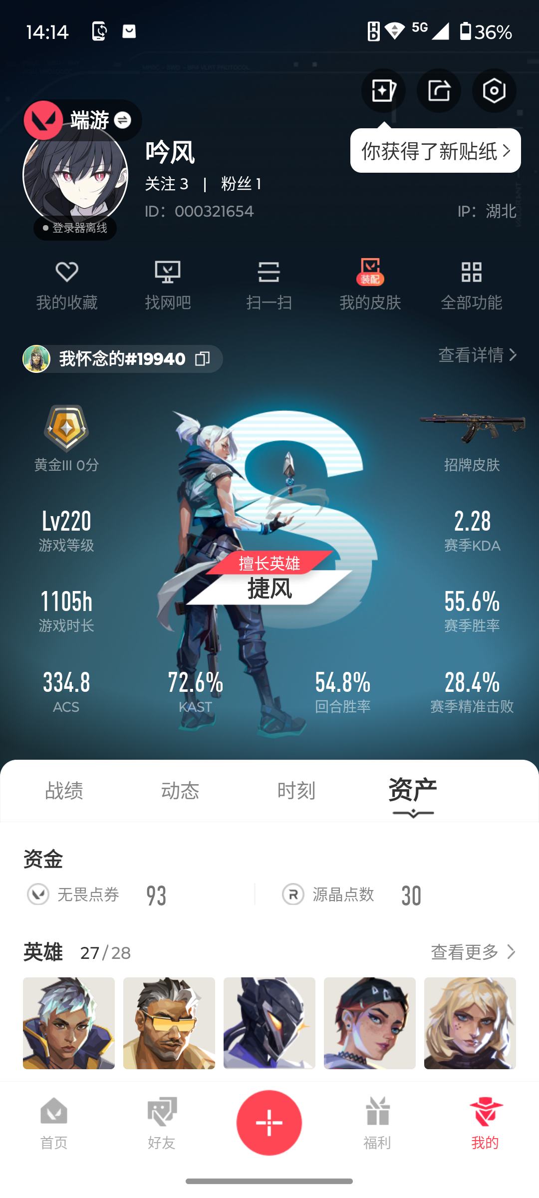 [14176128]S192004无畏契约/42等级/白银段位/16英雄/1皮肤/资产1290/已使用R点60/剩余R点130/ 盖亚的复仇-狂徒