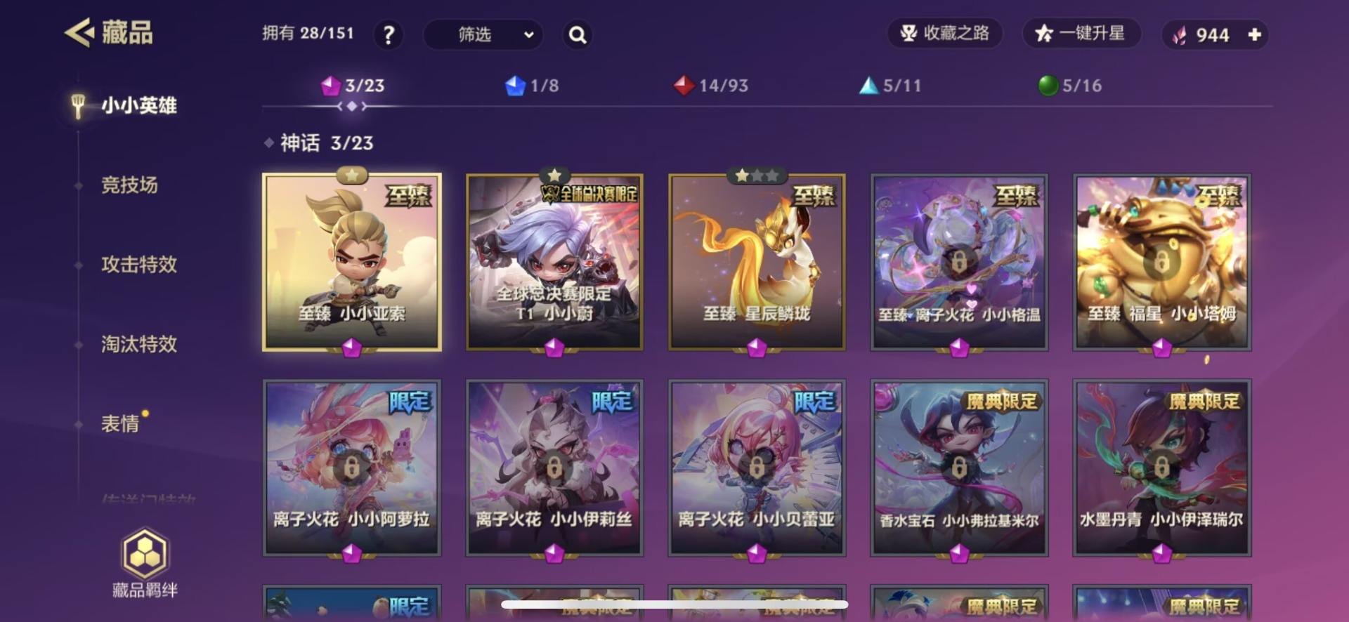 [14773508]【实名】:可修改【角色等级】:39【小小英雄数量】:28【小小英雄(神话)】:至臻 小小亚索,全球总决赛限定 T1 小小蔚,至臻 星辰鳞珑【竞技场(神话)】:幻境竞技场