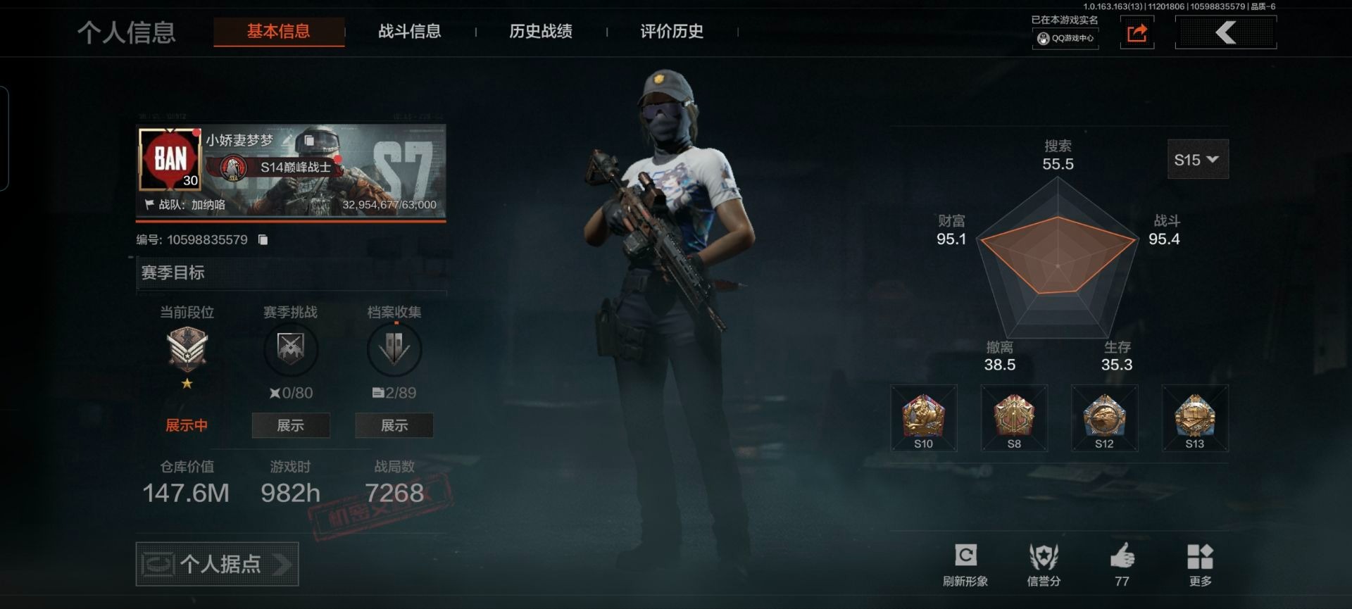 库存价值19.9 3近战武器 6金枪皮 可修改实名 【柯恩币数量】:359533【近战武器】:空腔战术,工兵铲,百炼恒常【金色枪皮】:旧王圣谕·QBZ191,战术大师·AEK,战术大师·AN94,包络战术·AKM,骑士之剑·AX50,骑士之剑·VSS【紫色枪皮】:潜渊蛇鳞·M4A1,骑士之剑·AKM,粉绒臻选·AN94【角色装扮(紫)】:高地武士套装