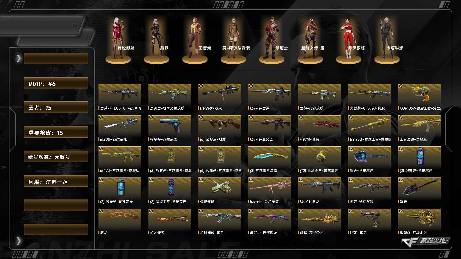 商品描述:[13743927]XH8764/东部/江苏一区/【东部生化号】/可排位/段位未定段/Lv.100 大元帅/VIP4/46V/【四防传说】/传说影煞/传说破晓/M200竞技荣光套/雷霆王者套/王者星霆/COP雷霆王者/USP冥王/柯尔特竞技荣光/炽芒蝶刃/【裁决三件套】/裁决/裁决音效卡/裁决叶芒苍灵/【生化】/完美四防传说影煞/6烈龙/斯泰尔蝴蝶/异变清道夫/迷你生化手雷/*4/两套竞技荣光雷/毁灭/【音效卡】/黑骑士音效卡/碧霄极光音效卡/炼狱百战金芒庆典舞曲音效卡/【枪皮】/金色蔷薇破浪逐光/毁灭/虹光风暴/毁灭白城浙江/毁灭黑曼巴/火麒麟百城23冠军/雷神刘备/雷神RLGD/雷神虎将/【四防角色】/王者炫/【角色】/荆棘/葵阿尔法武装/修道士/乔伊教练/【小人枪】/星神炽天使/雷神小红/牛牛AK47///永久AC/永久雷包/细节看图/【此账号未被封过十年】