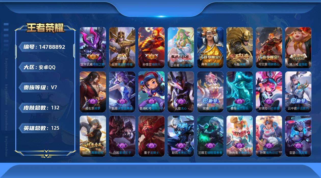 商品描述:[14788892]Xr44056-安卓Q-无二次-V7-至尊星耀III段位-125英雄-132皮肤-3传说-35史诗【传说皮肤】:后羿黄金射手座,宫本武藏地狱之眼,孙悟空地狱火【限定皮肤】:狄仁杰阴阳师,赵云皇家上将,庄周高山流水,元歌无心,典韦蓝屏警告,狄仁杰魔术师,狄仁杰万华元夜,达摩沙漠行僧,项羽海滩派对,老夫子醍醐杖,程咬金演武夺筹,兰陵王金庭之子,李元芳云中旅人,钟馗驱傩正仪,女娲朔望之晖,鬼谷子原初探秘者,苏烈千军破阵,沈梦溪大漠名商,裴擒虎擒涛扼浪,米莱狄御霄,云中君纤云弄巧,猪八戒猪悟能,嫦娥拒霜思,鲁班大师探海日志,桑启海盐诗旅,艾琳女武神,艾琳流音漫舞,司空震地狱燃心,张良古海寻踪,蒙犽百解令,鬼谷子天穹祈灯,刘邦剑破天穹【年限皮肤】:马超神威【赛季限定】:狄仁杰万华元夜,达摩沙漠行僧,老夫子醍醐杖,程咬金演武夺筹,兰陵王金庭之子,张良古海寻踪,李元芳云中旅人,钟馗驱傩正仪,鬼谷子原初探秘者,苏烈千军破阵,沈梦溪大漠名商,裴擒虎擒涛扼浪,米莱狄御霄,鲁班大师探海日志,桑启海盐诗旅,鬼谷子天穹祈灯,刘邦剑破天穹【战令限定】:典韦蓝屏警告,艾琳流音漫舞,女娲朔望之晖,司空震地狱燃心【史诗皮肤】:鲁班七号电玩小子,赵云皇家上将,赵云未来纪元,貂蝉圣诞恋歌,甄姬冰雪圆舞曲,狄仁杰魔术师,廉颇地狱岩魂,宫本武藏鬼剑武藏,孙尚香水果甜心,妲己魅力维加斯,墨子龙骑士,墨子金属风暴,刘禅绅士熊喵,曹操幽灵船长,兰陵王暗隐猎兽者,亚瑟心灵战警,雅典娜冰冠公主,安琪拉心灵骇客,蔡文姬舞动绿茵,刘禅天才门将,李元芳逐浪之夏,白起星夜王子,孙策猫狗日记,典韦蓝屏警告,狄仁杰鹰眼统帅,橘右京修罗,马超神威,云中君纤云弄巧,猪八戒猪悟能,庄周高山流水,嫦娥拒霜思,元歌无心,司空震地狱燃心,蒙犽百解令,公孙离涂山容容【其他皮肤】:项羽海滩派对,韩信教廷特使,韩信街头霸王,达摩大发明家,芈月红桃皇后,艾琳女武神,扁鹊化身博士,宫本武藏未来纪元,安琪拉玩偶对对碰,孙膑天使之翼,妲己少女阿狸,典韦黄金武士,亚瑟死亡骑士,花木兰兔女郎,后羿阿尔法小队,狄仁杰阴阳师,刘备纽约教父,钟无艳海滩丽影,狂铁命运角斗场,诸葛亮掌控之力,鬼谷子幻乐之宴,米莱狄御霄,明世隐虹云星官,女娲朔望之晖,小乔丁香结,吕布野性能量,孙膑归虚梦演,哪吒次元突破,老夫子醍醐杖,狂铁特工战影,鬼谷子原初探秘者,狄仁