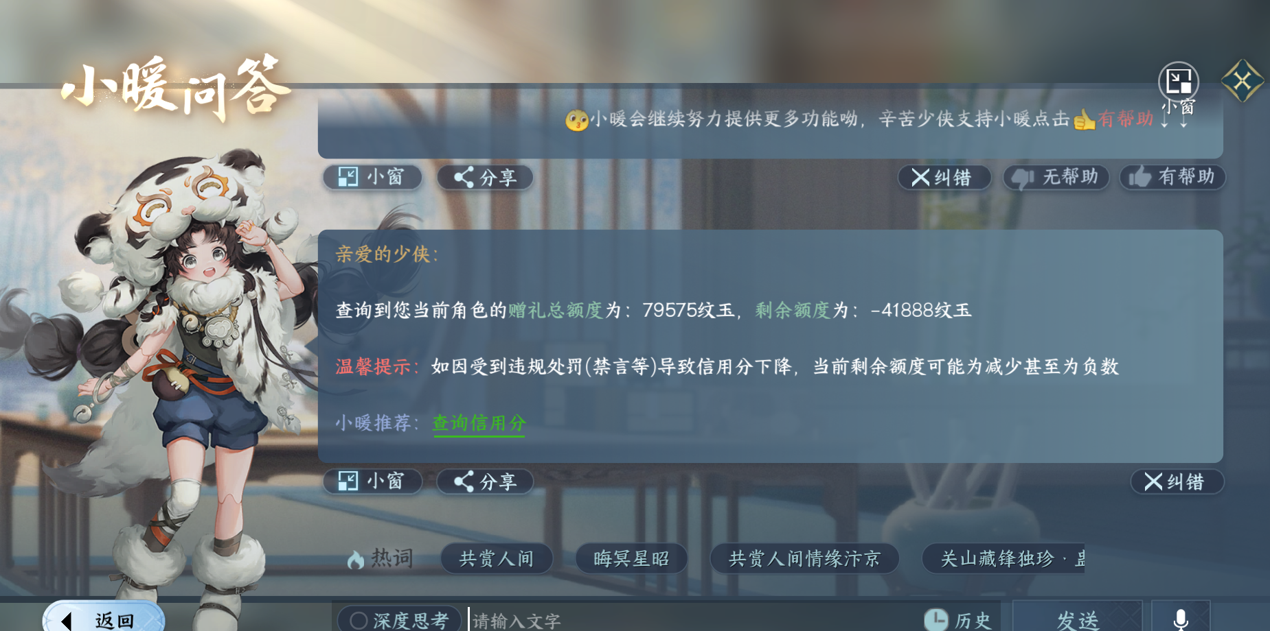 XY-076643134 战力值460477 总评460477 角色等级89 衣品值209790 国色值134400 已用天赏石29 未用天赏石0 天霓染数量9 【网易邮箱账号】 【无换绑冷却】 【素问】 【男】 【7级】 【把酒临风】 商城外观1 商城外观:云极天穹;