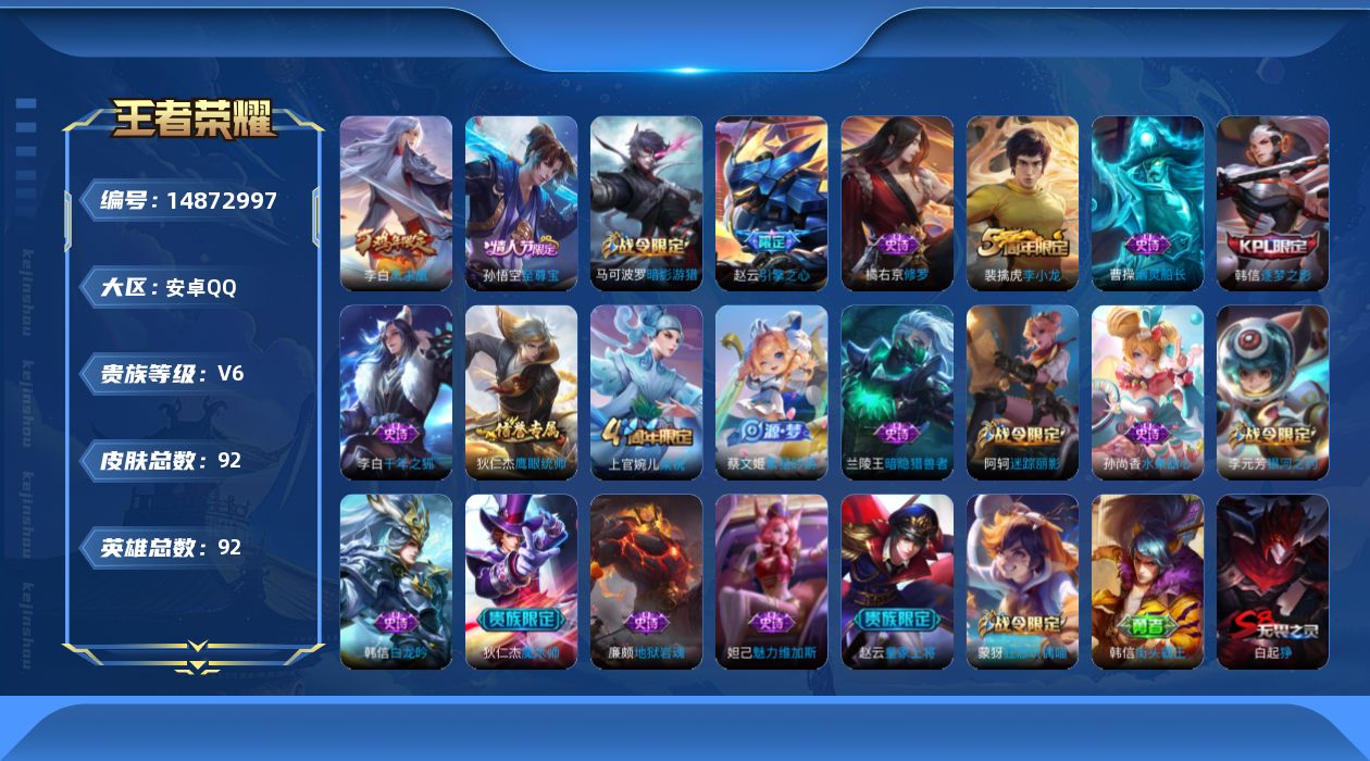 商品描述:[14872997]Xr46981-可修改-安卓Q-V6-荣耀黄金IV段位-92英雄-92皮肤-1传说-21史诗【传说皮肤】:李白凤求凰【限定皮肤】:白起狰,狄仁杰阴阳师,虞姬凯尔特女王,赵云皇家上将,赵云引擎之心,阿轲迷踪丽影,夏侯惇朔风刀,马可波罗暗影游猎,狄仁杰魔术师,狄仁杰万华元夜,项羽海滩派对,老夫子醍醐杖,程咬金演武夺筹,刘邦夺宝奇兵,韩信逐梦之影,兰陵王金庭之子,孙悟空至尊宝,牛魔御旌,李元芳银河之约,钟馗驱傩正仪,雅典娜单词大作战,蔡文姬繁星吟游,鬼谷子原初探秘者,苏烈千军破阵,弈星混沌棋,沈梦溪星空之诺,明世隐疑决卦,裴擒虎李小龙,狂铁御狮,米莱狄御霄,盾山御銮,猪八戒西部大镖客,上官婉儿梁祝,蒙犽狂想玩偶喵【年限皮肤】:李白凤求凰【赛季限定】:白起狰,夏侯惇朔风刀,狄仁杰万华元夜,老夫子醍醐杖,程咬金演武夺筹,兰陵王金庭之子,牛魔御旌,虞姬凯尔特女王,钟馗驱傩正仪,鬼谷子原初探秘者,苏烈千军破阵,弈星混沌棋,明世隐疑决卦,狂铁御狮,米莱狄御霄,盾山御銮【战令限定】:阿轲迷踪丽影,马可波罗暗影游猎,刘邦夺宝奇兵,李元芳银河之约,雅典娜单词大作战,沈梦溪星空之诺,猪八戒西部大镖客,蒙犽狂想玩偶喵【史诗皮肤】:赵云皇家上将,狄仁杰魔术师,廉颇地狱岩魂,孙尚香水果甜心,妲己魅力维加斯,曹操幽灵船长,李白千年之狐,韩信白龙吟,孙悟空至尊宝,赵云引擎之心,韩信逐梦之影,兰陵王暗隐猎兽者,狄仁杰鹰眼统帅,上官婉儿梁祝,蔡文姬繁星吟游,李元芳银河之约,阿轲迷踪丽影,橘右京修罗,马可波罗暗影游猎,蒙犽狂想玩偶喵,裴擒虎李小龙【其他皮肤】:项羽海滩派对,韩信教廷特使,韩信街头霸王,赵云白执事,赵云忍炎影,白起白色死神,安琪拉玩偶对对碰,妲己少女阿狸,花木兰兔女郎,张飞五福同心,狄仁杰阴阳师,刘备汉昭烈帝,关羽龙腾万里,虞姬凯尔特女王,白起狰,钟无艳海滩丽影,宫本武藏霸王丸,狂铁命运角斗场,老夫子功夫老勺,狂铁御狮,米莱狄御霄,牛魔御旌,盾山御銮,孙膑归虚梦演,沈梦溪鲨炮海盗猫,夏侯惇朔风刀,沈梦溪星空之诺,弈星混沌棋,哪吒次元突破,鲁班七号黑桃队长,明世隐疑决卦,刘邦夺宝奇兵,老夫子醍醐杖,猪八戒西部大镖客,鬼谷子原初探秘者,雅典娜单词大作战,狄仁杰万华元夜,程咬金演武夺筹,钟馗驱傩正仪,鲁班大师乓乓大师,苏烈千军破阵,兰陵王金庭之子,鲁班七号福禄兄弟,花木兰剑舞者,王