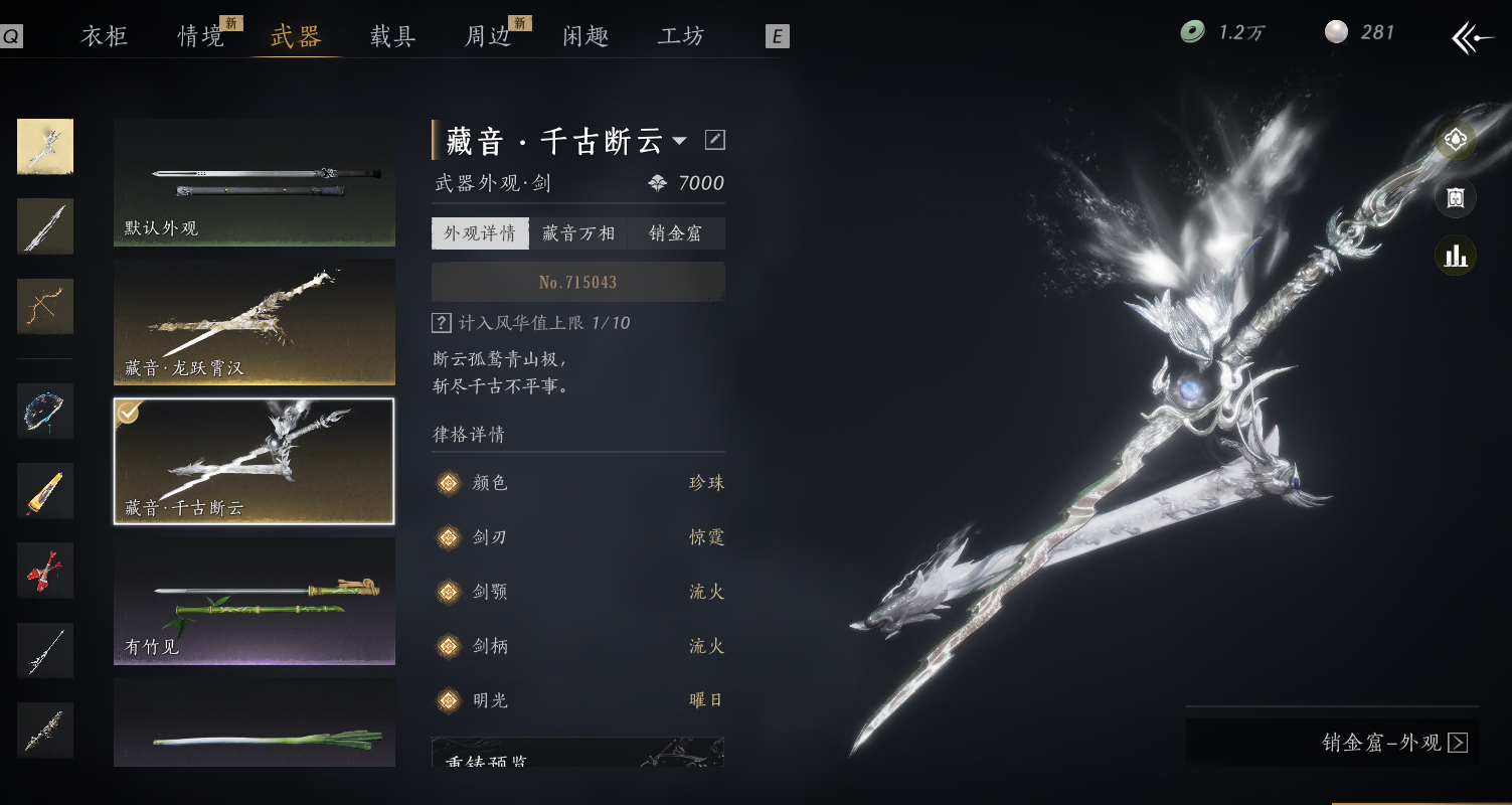 商品描述:XY-076667879 【1.5亿宝钱,陌刀一代剑可封装】 风华值155541 武林造诣(鹅)35940 已用八音窍数量26 等级100 角色性别【文本】男 【绝境】 【无换绑CD】 【未绑定或可换绑】 【未注册】 【不支持人脸包赔】 【男】 【无】 【安卓】 【是】 【是】 稀有套装9 稀有发型11 稀有武器外观3 稀有武学奇术10 套装23 披挂1 稀有套装:天上白玉京,月中天阙,雪满川,风吟彼岸,如碎霜天,沧海龙吟,将星入命,瑞鹤仙,西极坠日; 稀有发型:芙蓉泣露,云深归处,浮云卷霭,鹊桥仙,重明,浮岚,笑倚东风,我自擎天,倾芳樽,天志明鬼,弄清影; 稀有武器外观:藏音·龙跃霄汉,藏音·万古悲尘(五金),藏音·千古断云(五金); 稀有武学奇术:一斩绛天,万剑归宗,戍魂丹心,龙战玄黄,龙腾九霄,金乌坠火,鳞跃天倾,龙战千山,天龙舞火,黄龙断戟; 套装:醉蓬莱,铁马金戈,将星入命,白龙,纵横,瑞鹤仙,青草原,醉云醒雨,金滟玉团,云遥鹤影,蓬莱翎,金池鲤,西极坠日,句芒,啸月,蝎心蛟影,幽明既通,夜郎幽问,鹊衔夜,蜀戏春,九间当铺,驰走西风,弄清影; 披挂:西极坠日;
