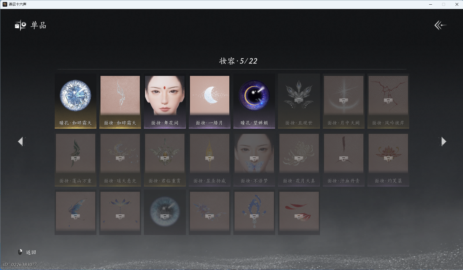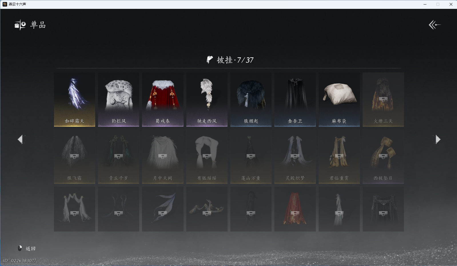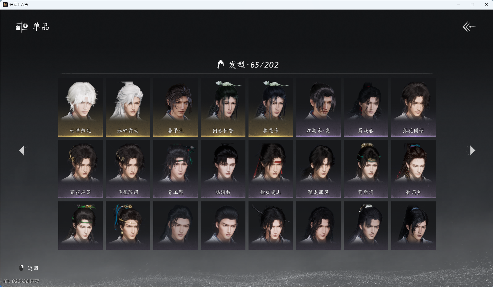 商品描述: 【如碎霜天,云深归处,5套258时装,心法6655】 风华值27285 武林造诣(鹅)30832 已用八音窍数量3 未用八音窍数量0 等级95 角色性别【文本】男 【绝境】 【无换绑CD】 【未绑定或可换绑】 【未注册】 【不支持人脸包赔】 【男】 【无】 【ios】 【是】 【是】 【否】 稀有套装1 稀有发型1 套装5 稀有套装:如碎霜天; 稀有发型:云深归处; 套装:夜郎幽问,蝎心蛟影,鹊衔夜,风花雾,蜀戏春;