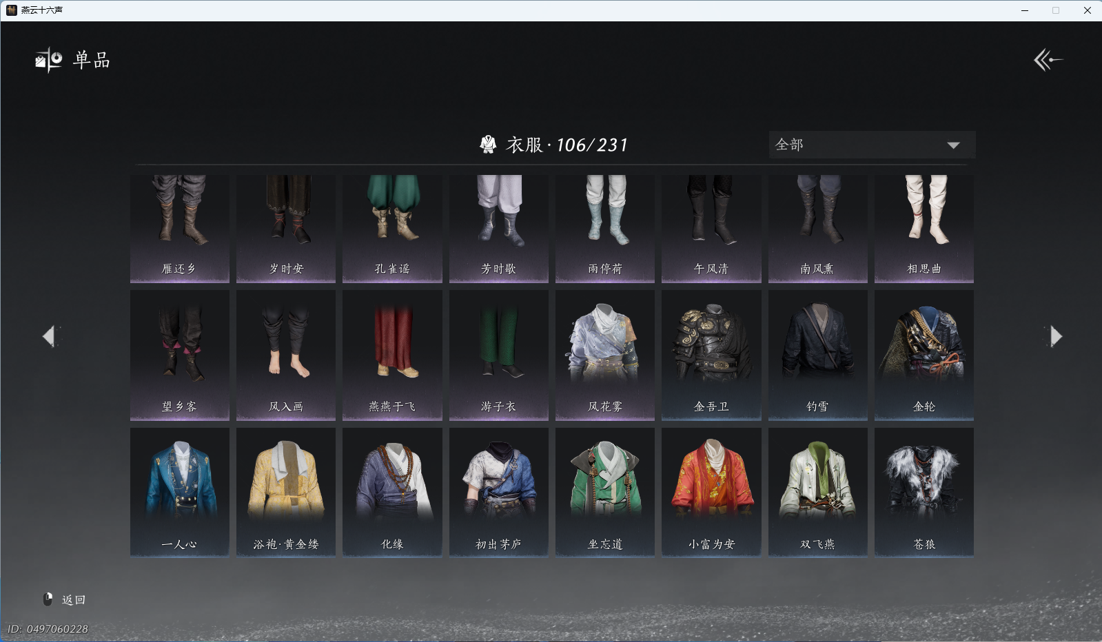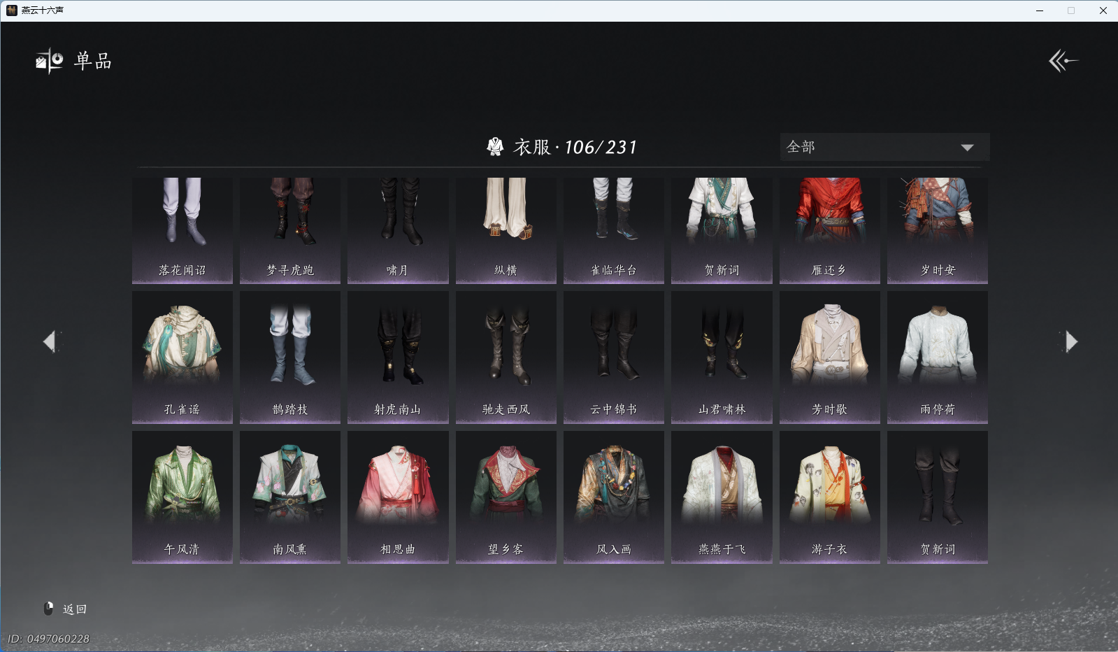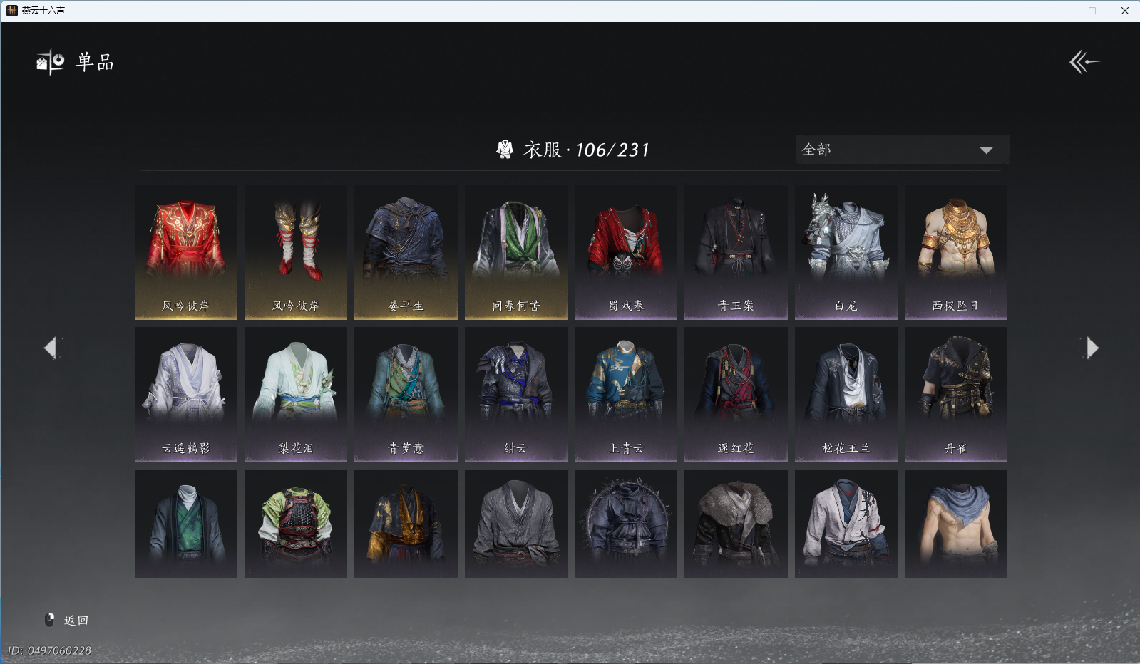 商品描述: 【风吟彼岸,醉蓬莱,西极坠日,芙蓉泣露,朔风雪,5套258时装,心法6666】 风华值56466 武林造诣(鹅)35517 已用八音窍数量4 未用八音窍数量0 等级100 角色性别【文本】男 【绝境】 【无换绑CD】 【未绑定或可换绑】 【未注册】 【不支持人脸包赔】 【男】 【无】 【ios】 【是】 【是】 【否】 稀有套装2 稀有发型2 稀有套装:西极坠日,风吟彼岸; 稀有发型:朔风雪,芙蓉泣露;