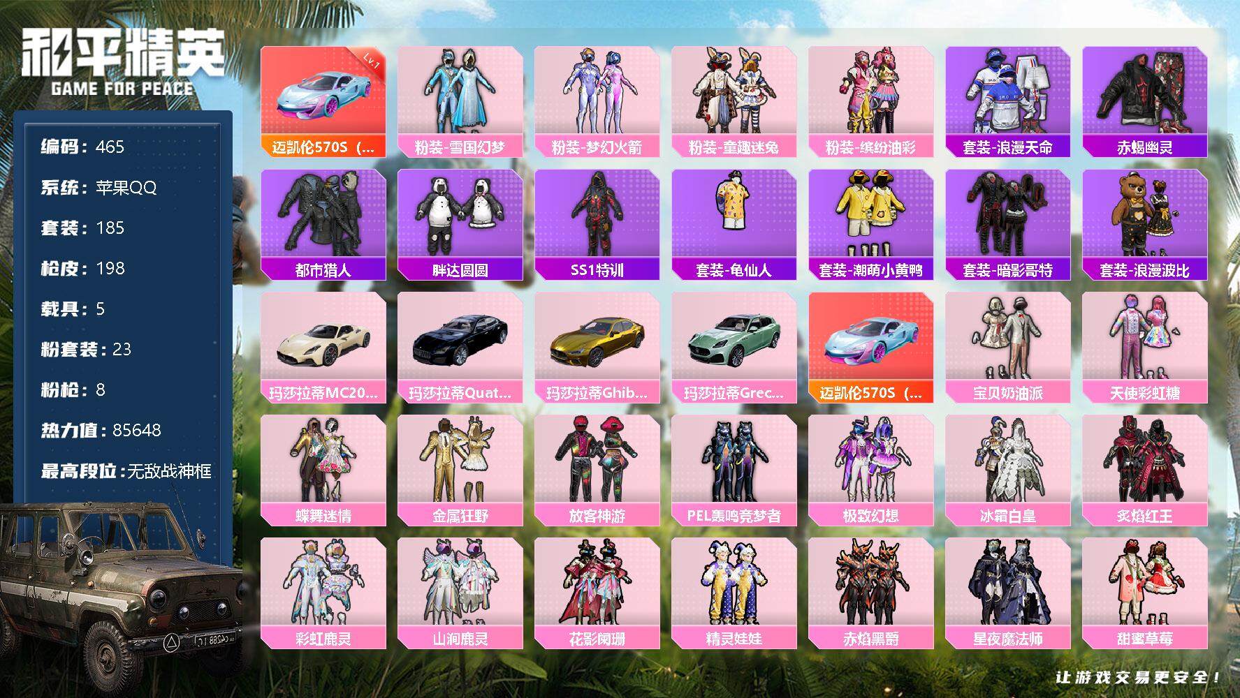 【苹果QQ】280套装-284枪皮-6载具 苹果手Q-5王牌印记-24粉装-8特效枪-6载具-113797热力值-280套装-284枪皮 【24粉装】角色-歌者泠鸢,套装-音爆索尼克,套装-冰霜白皇,套装-盖世英雄,套装-光明术士,套装-梦幻火箭,套装-诡面斩,套装-未来战士,套装-海盐物语,套装-迷蝶贵族,套装-星之彼岸,套装-暗夜鎏金,套装-灵感创作师,套装-绚金战神,套装-金风玉露,套装-宝贝奶油派,套装-蜜桃特工,套装-向日葵,套装-垂柳戏鸭,套装-炙焰红王,套装-橘柚倾心,套装-俏皮狐尾,套装-彩虹甜喵,套装-天禅智恒 【8特效枪】GROZA-香水柠檬/5级,M249-彩虹甜喵/2级,M16A4-垂柳戏鸭/1级,AKM-星际浪客/4级,AWM-橘柚倾心/4级,M416-五爪金龙/5级,M24-星之信仰/6级,SCAR-L-青春物语/5级 【9稀有紫装】都市猎人,奇异狩猎者,暗影哥特,深海小丑鱼,浪漫天命,雪山精英,迅捷狂鲨,暗夜魅影,东方飞龙 【6稀有载具】玛莎拉蒂Ghibli(金),阿斯顿·马丁DBS(绿),特斯拉Roadster(沁心粉),路特斯EVIJA(星际黄),焰龙咆哮,极速兔兔车 【1僚机】僚机-萌兔起飞【安卓QQ】95套装-132枪皮-1载具 零号机款机体服 黄螳螂 SCAR-L-锦绣绵绵 团圆交子 瑞龙福将 极速红龙 黑色刀锋 M762-瑞龙福将