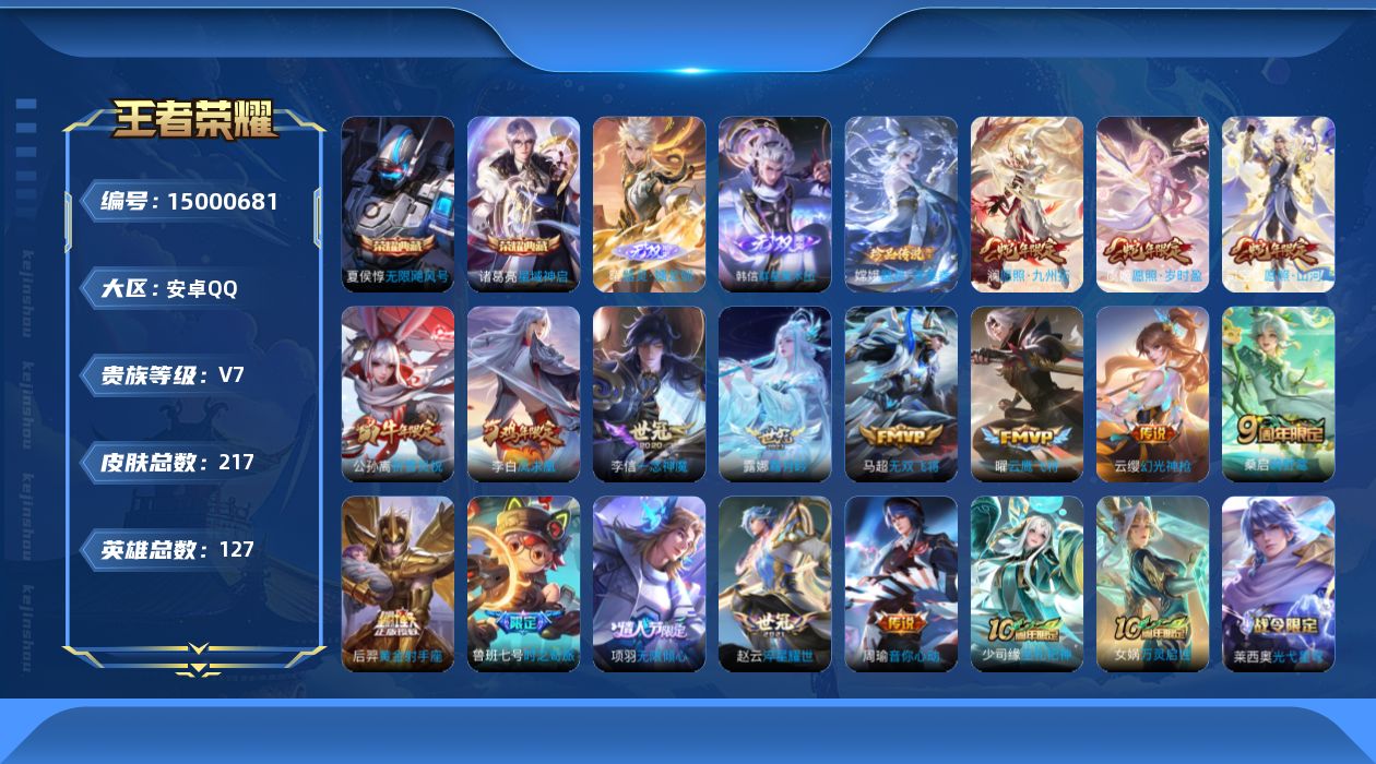 商品描述:[15000681]Xr46113-安卓Q-可二次-V7-最强王者段位-127英雄-216皮肤-2典藏皮肤-2无双-1珍品传说-17传说-66史诗【英雄全皮】:空空儿全皮【荣耀典藏】:夏侯惇无限飓风号,诸葛亮星域神启【无双皮肤】:韩信群星魔术团,曜器灵螭龙剑【珍品传说】:嫦娥器灵落星盏【传说皮肤】:后羿神树通天,司空震愿照山河定,澜愿照九州拓,虞姬愿照岁时盈,云缨幻光神枪,桑启鸣野蒿,露娜霜月吟,鲁班七号时之奇旅,项羽无限倾心,马超无双飞将,赵云淬星耀世,周瑜音你心动,公孙离祈雪灵祝,曜云鹰飞将,李信一念神魔,后羿黄金射手座,李白凤求凰【限定皮肤】:姜子牙天穹之誓,狄仁杰阴阳师,赵云皇家上将,孙尚香蔷薇恋人,鲁班七号时之奇旅,芈月重明,元歌无心,典韦穷奇,马可波罗暗影游猎,狄仁杰魔术师,达摩沙漠行僧,项羽海滩派对,项羽无限倾心,韩信逐梦之影,韩信傲雪梅枪,兰陵王金庭之子,孙悟空孙行者,后羿圣弓游侠,李元芳云中旅人,钟馗驱傩正仪,杨玉环遇见飞天,太乙真人饕餮,鬼谷子五谷丰年,公孙离祈雪灵祝,沈梦溪大漠名商,裴擒虎擒涛扼浪,狂铁御狮,上官婉儿神器万象笔,嫦娥拒霜思,鲁班大师探海日志,桑启海盐诗旅,艾琳流音漫舞,阿古朵江河有灵,张良古海寻踪,蒙犽百解令,鬼谷子天穹祈灯,伽罗琥珀纪元,姬小满妄想食味,沈梦溪龙舞盛年,鲁班七号蔬乡物语,李元芳蔬乡物语,刘邦剑破天穹,程咬金群星魔术团,韩信群星魔术团,关羽决胜骁骑,镜青焰无极,项羽苍威无极,周瑜熔金海岸【年限皮肤】:李白凤求凰,公孙离祈雪灵祝【赛季限定】:芈月重明,典韦穷奇,达摩沙漠行僧,兰陵王金庭之子,张良古海寻踪,李元芳云中旅人,钟馗驱傩正仪,太乙真人饕餮,沈梦溪大漠名商,裴擒虎擒涛扼浪,狂铁御狮,鲁班大师探海日志,桑启海盐诗旅,鬼谷子天穹祈灯,刘邦剑破天穹,姜子牙天穹之誓【战令限定】:马可波罗暗影游猎,艾琳流音漫舞,后羿圣弓游侠,鲁班七号蔬乡物语,李元芳蔬乡物语,镜青焰无极,项羽苍威无极【史诗皮肤】:赵云皇家上将,赵云未来纪元,貂蝉圣诞恋歌,甄姬冰雪圆舞曲,王昭君偶像歌手,狄仁杰魔术师,廉颇地狱岩魂,宫本武藏鬼剑武藏,孙尚香蔷薇恋人,孙尚香水果甜心,嬴政暗夜贵公子,嬴政摇滚巨星,妲己魅力维加斯,墨子金属风暴,吕布圣诞狂欢,曹操幽灵船长,李白千年之狐,吕布末日机甲,花木兰水晶猎龙者,刘邦德古拉伯爵,韩信逐梦之影,夏侯惇乘风