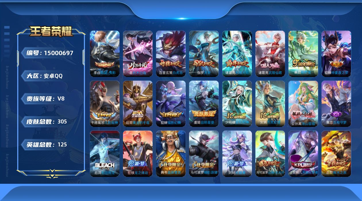 商品描述:[15000697]Xr42714-安卓Q-无二次-V8-最强王者段位-125英雄-305皮肤-1典藏皮肤-1珍品传说-10传说-80史诗【英雄全皮】:阿轲全皮,鬼谷子全皮,鲁班大师全皮【荣耀典藏】:李白鸣剑曳影【珍品传说】:暃朽木白哉【传说皮肤】:桑启鸣野蒿,诸葛亮时雨天司,虞姬启明星使,伽罗太华,貂蝉猫影幻舞,干将莫邪久胜战神,百里玄策白虎志,后羿黄金射手座,诸葛亮武陵仙君,貂蝉仲夏夜之梦【限定皮肤】:白起狰,狄仁杰阴阳师,赵云皇家上将,孙尚香蔷薇恋人,庄周高山流水,阿轲迷踪丽影,芈月重明,芈月幻夜卜梦,周瑜赤莲之焰,元歌云间偶戏,元歌无心,夏侯惇朔风刀,甄姬游园惊梦,曹操天狼征服者,典韦穷奇,典韦蓝屏警告,马可波罗暗影游猎,马可波罗山海玄木吟,狄仁杰魔术师,狄仁杰万华元夜,达摩星际陆战队,达摩沙漠行僧,项羽海滩派对,老夫子醍醐杖,程咬金演武夺筹,刘邦夺宝奇兵,韩信飞衡,兰陵王驯魔猎人,兰陵王金庭之子,亚瑟潮玩骑士王,牛魔御旌,后羿辉光之辰,后羿圣弓游侠,李元芳银河之约,李元芳云中旅人,虞姬启明星使,钟馗驱傩正仪,女娲朔望之晖,干将莫邪真爱魔法,雅典娜单词大作战,雅典娜黎明之约,太乙真人饕餮,鬼谷子原初探秘者,鬼谷子五谷丰年,诸葛亮武陵仙君,诸葛亮时雨天司,黄忠火炮绅士,苏烈千军破阵,百里玄策白虎志,百里玄策原初追逐者,弈星混沌棋,梦奇顽趣,沈梦溪星空之诺,沈梦溪大漠名商,明世隐疑决卦,裴擒虎李小龙,裴擒虎擒涛扼浪,狂铁御狮,米莱狄御霄,米莱狄胡桃异想国,云中君纤云弄巧,伽罗太华,猪八戒西部大镖客,猪八戒猪悟能,上官婉儿梁祝,上官婉儿天狼绘梦者,嫦娥拒霜思,蒙犽狂想玩偶喵,鲁班大师匿光启智者,鲁班大师探海日志,桑启海盐诗旅,艾琳女武神,阿古朵江河有灵,张良古海寻踪,鬼谷子天穹祈灯,姬小满妄想食味,刘邦剑破天穹,程咬金群星魔术团,周瑜熔金海岸【年限皮肤】:百里玄策白虎志,后羿辉光之辰,诸葛亮时雨天司,伽罗太华,韩信飞衡,马可波罗山海玄木吟【赛季限定】:白起狰,芈月重明,夏侯惇朔风刀,典韦穷奇,狄仁杰万华元夜,达摩沙漠行僧,老夫子醍醐杖,程咬金演武夺筹,兰陵王金庭之子,张良古海寻踪,牛魔御旌,李元芳云中旅人,钟馗驱傩正仪,雅典娜黎明之约,太乙真人饕餮,鬼谷子原初探秘者,苏烈千军破阵,百里玄策原初追逐者,弈星混沌棋,梦奇顽趣,沈梦溪大漠名商,明世隐疑决卦,裴擒虎擒涛扼浪,