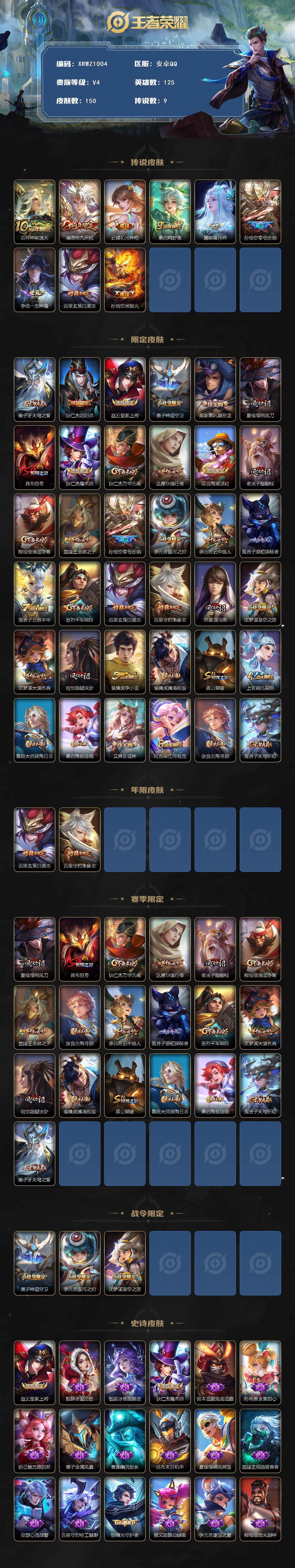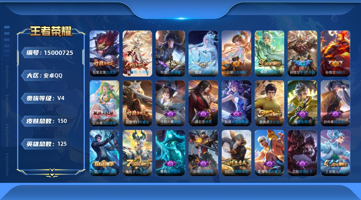 商品描述:[15000725]xr 45359- 可二次-安卓Q-V4-尊贵铂金I段位-125英雄-150皮肤-9传说-31史诗【传说皮肤】:后羿神树通天,澜愿照九州拓,云缨幻光神枪,桑启鸣野蒿,露娜霜月吟,孙悟空零号赤焰,李信一念神魔,百里玄策白虎志,孙悟空地狱火【限定皮肤】:姜子牙天穹之誓,狄仁杰阴阳师,赵云皇家上将,墨子神迹守卫,高渐离玩趣恶龙,夏侯惇朔风刀,典韦穷奇,狄仁杰魔术师,狄仁杰万华元夜,达摩沙漠行僧,项羽海滩派对,老夫子醍醐杖,程咬金演武夺筹,兰陵王金庭之子,孙悟空零号赤焰,李元芳银河之约,李元芳云中旅人,鬼谷子原初探秘者,鬼谷子五谷丰年,苏烈千军破阵,百里玄策白虎志,百里守约朱雀志,弈星混沌棋,沈梦溪星空之诺,沈梦溪大漠名商,明世隐疑决卦,裴擒虎李小龙,裴擒虎擒涛扼浪,盾山御銮,上官婉儿梁祝,鲁班大师探海日志,桑启海盐诗旅,艾琳女武神,阿古朵江河有灵,张良古海寻踪,鬼谷子天穹祈灯【年限皮肤】:百里玄策白虎志,百里守约朱雀志【赛季限定】:夏侯惇朔风刀,典韦穷奇,狄仁杰万华元夜,达摩沙漠行僧,老夫子醍醐杖,程咬金演武夺筹,兰陵王金庭之子,张良古海寻踪,李元芳云中旅人,鬼谷子原初探秘者,苏烈千军破阵,弈星混沌棋,沈梦溪大漠名商,明世隐疑决卦,裴擒虎擒涛扼浪,盾山御銮,鲁班大师探海日志,桑启海盐诗旅,鬼谷子天穹祈灯,姜子牙天穹之誓【战令限定】:墨子神迹守卫,李元芳银河之约,沈梦溪星空之诺【史诗皮肤】:赵云皇家上将,貂蝉圣诞恋歌,甄姬冰雪圆舞曲,狄仁杰魔术师,宫本武藏鬼剑武藏,孙尚香水果甜心,妲己魅力维加斯,墨子金属风暴,曹操幽灵船长,吕布末日机甲,夏侯惇乘风破浪,兰陵王暗隐猎兽者,亚瑟心灵战警,百里守约特工魅影,铠曙光守护者,蔡文姬舞动绿茵,李元芳逐浪之夏,程咬金功夫厨神,白起星夜王子,百里守约朱雀志,狄仁杰鹰眼统帅,上官婉儿梁祝,李元芳银河之约,不知火舞魅语,橘右京修罗,孙尚香时之恋人,裴擒虎李小龙,澜赏金猎手,鬼谷子五谷丰年,阿古朵江河有灵,公孙离涂山容容【其他皮肤】:项羽海滩派对,韩信教廷特使,韩信街头霸王,达摩大发明家,赵云白执事,赵云忍炎影,艾琳女武神,白起白色死神,牛魔西部大镖客,宫本武藏未来纪元,安琪拉玩偶对对碰,姜子牙时尚教父,典韦黄金武士,亚瑟死亡骑士,达摩拳王,花木兰兔女郎,张飞五福同心,甄姬花好人间,刘备万事如意,宫本武藏万象初新,后羿阿尔法小队
