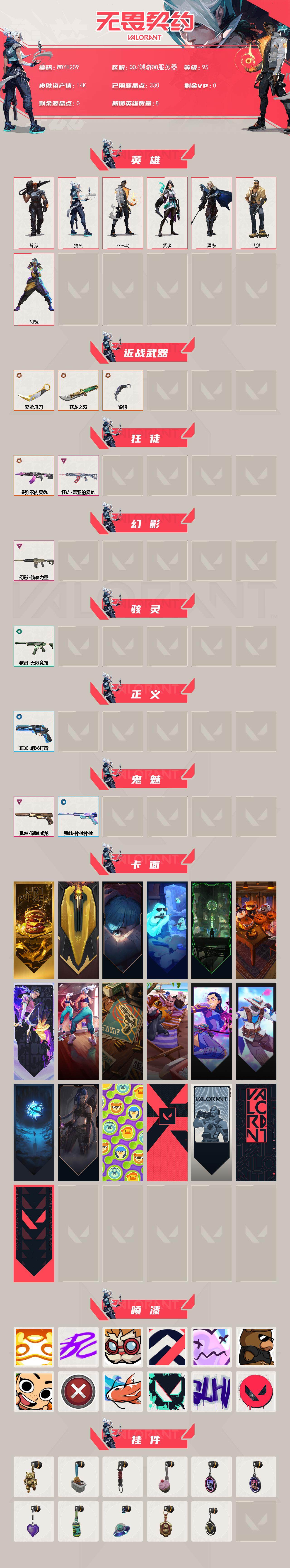 商品描述:【WWYH209】终极*4/卓越*3/皮肤*13/等级*95/段位:铂金/幻棱/炼狱/钛狐/捷风/不死鸟/贤者/猎枭/近战武器-影钩/近战武器-5周年//公测重制版 苍龙之刃/近战武器-紫金爪刀/狂徒-多弥尔的复仇/狂徒-盖亚的复仇/幻影-侦察力量/骇灵-无限竞技/正义-纳米打击/鬼魅-耀鳞威龙/鬼魅-扑棱扑棱/终章:激斗汉堡 卡面/进入射程 卡面/《双城之战》拥抱 卡面/精灵大战 卡面/欢迎来到底城 卡面/南瓜盛典 卡面/无畏契约:暮蝶 卡面/热舞环节 卡面/正义的化身 卡面/战术小伙伴的夏日 卡面/无畏契约GO!第一卷:芮娜 卡面/无畏契约GO!第一卷:零 卡面/无垠星环 卡面/《双城之