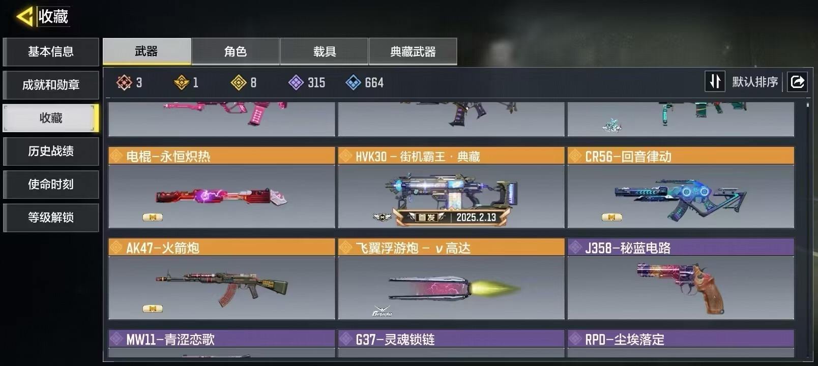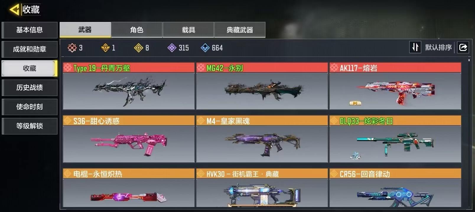 商品描述:[15049009]371级 3神话 1典藏 8传说 315史诗 段位白银 可二次 可修改实名 【典藏枪械】HVK30-街机霸王·典藏【神话枪械】AK117-熔岩,MG42-永别,Type19-丹青万壑【传说枪械】M4-皇家黑魂,S36-甜心诱惑,AK47-火箭炮,电棍-永恒炽热,CR56-回音律动,DLQ33-炫彩冬日