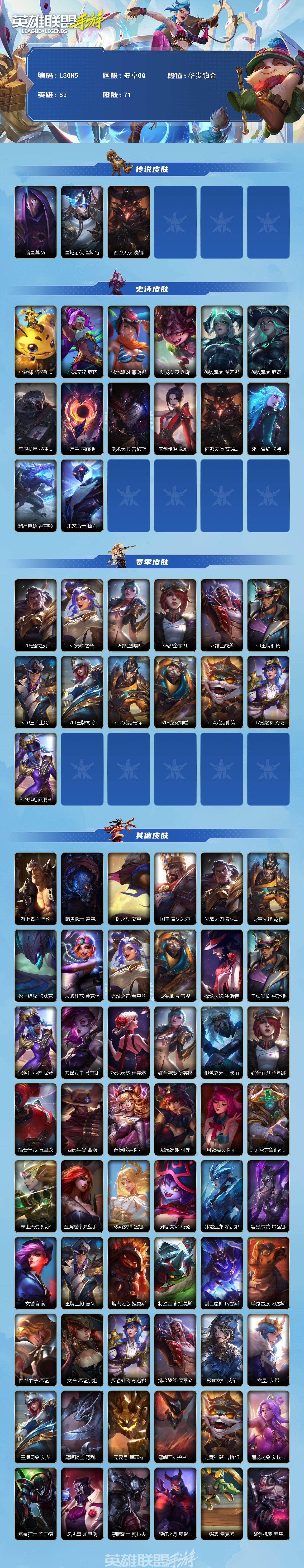商品描述:【LSQH5】83英雄/71皮肤/3传说/华贵铂金/暗星尊 烬/星域游侠 崔斯特/西部天使 赛娜/小蜜蜂 努努和威朗普/斗魂无双 尼菈/泳池派对 菲奥娜/驯龙女巫 璐璐/破败军团 希瓦娜/破败军团 厄运小姐/禁卫机甲 格雷福斯/暗星 墨菲特/奥术大师 吉格斯/玉剑传说 武剑仙 锐雯/西部天使 艾瑞莉娅/死亡誓约 卡特琳娜/黯晶巨鳄 雷克顿/未来战士 锤石/s1光耀之刃/s2光耀之芒/s5绯金魅影/s6绯金丽刃/s7绯金战斧/s9王牌舰长/s10王牌上将/s11王牌司令/s12龙冕先锋/s13龙冕御盾/s14龙冕神策/s17冠翎御风使/S19冠翎征服者/海上霸主 盖伦/暗黑武士 雷恩加尔/时之
